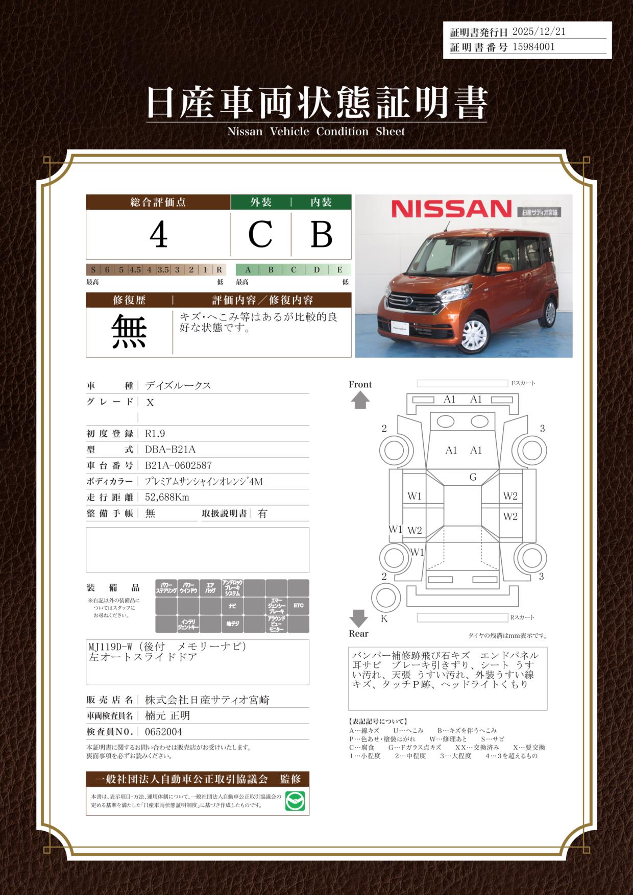 この度は当店を検索頂き誠にありがとうございます。今話題のe-Powerや100%電気で走る軽自動車サクラ、安全装置搭載車を多数展示!価格は総額表示で分りやすく、更に日産のワイド保証付で安心!お買得車を多数ご準備して、ご来場を心よりお待ちしております。12月は『冬のお買得中古車フェア!』を開催!期間R7年12月1日(月)~12月29日(月)迄。毎週、火・水曜日が定休日。