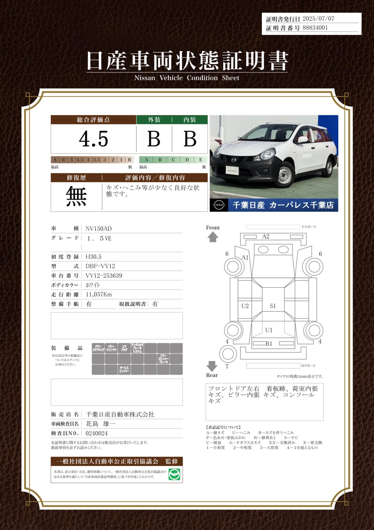 評価機関 : 日産車両状態証明