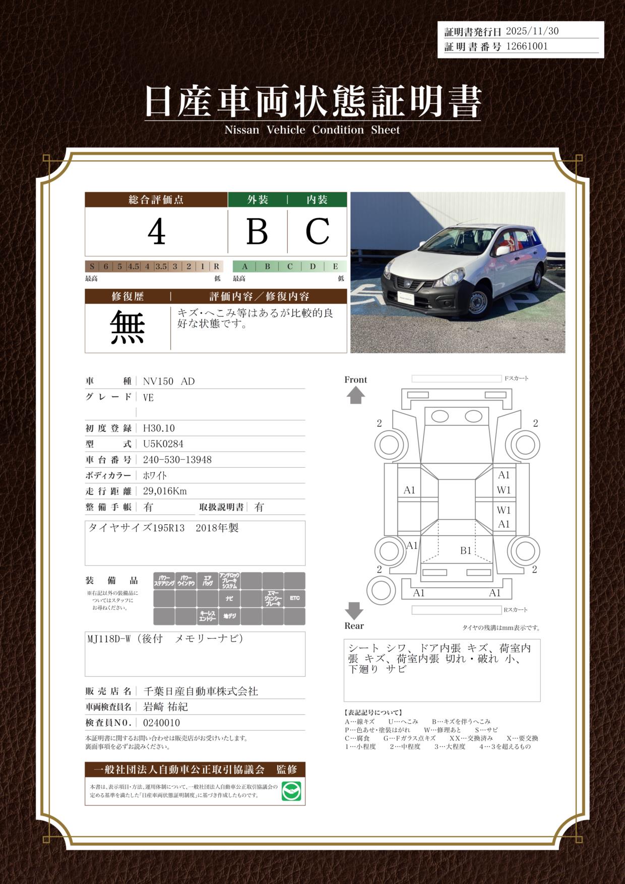 評価機関 : 日産車両状態証明