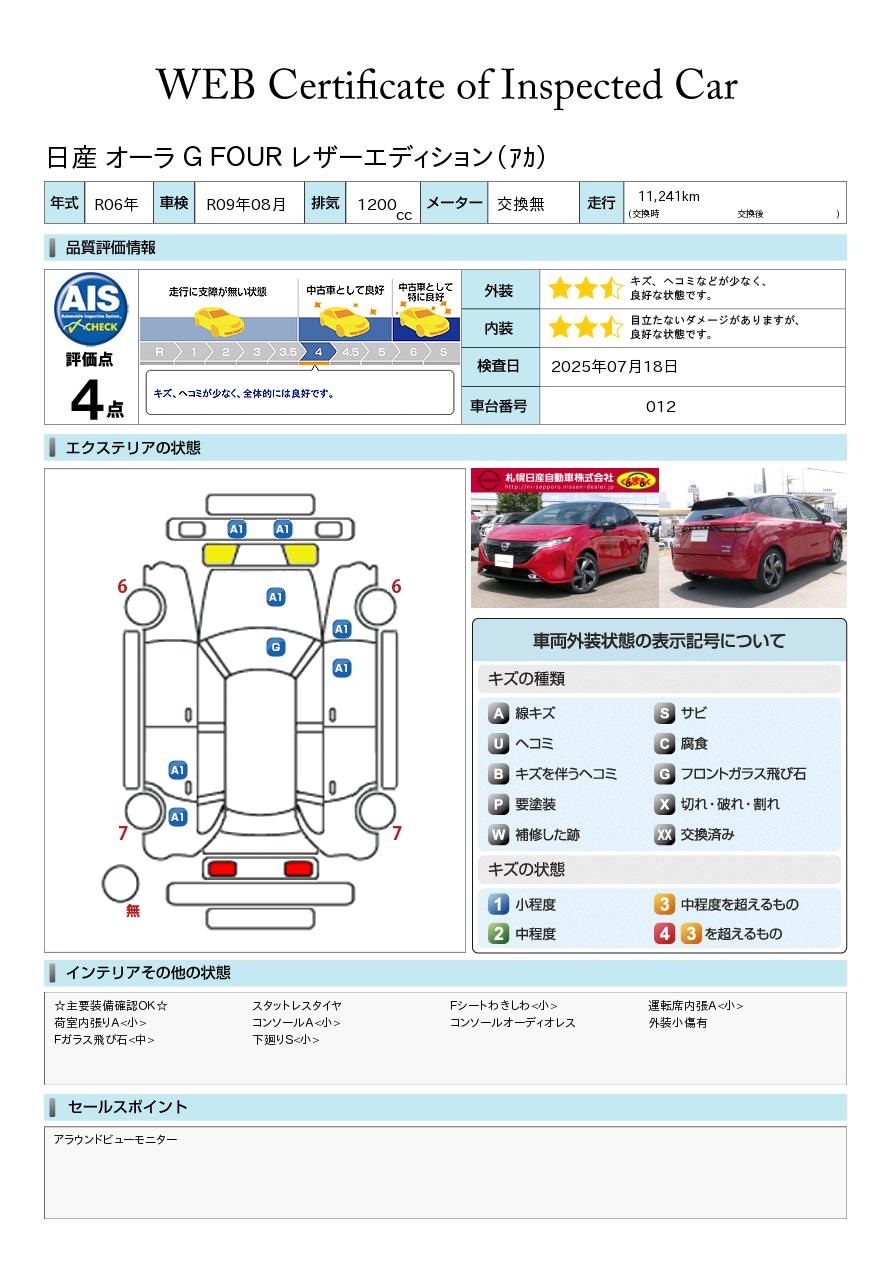 ノートオーラ 1200cc 1.2 G FOUR レザーエディション 4WD 当社試乗車アップ