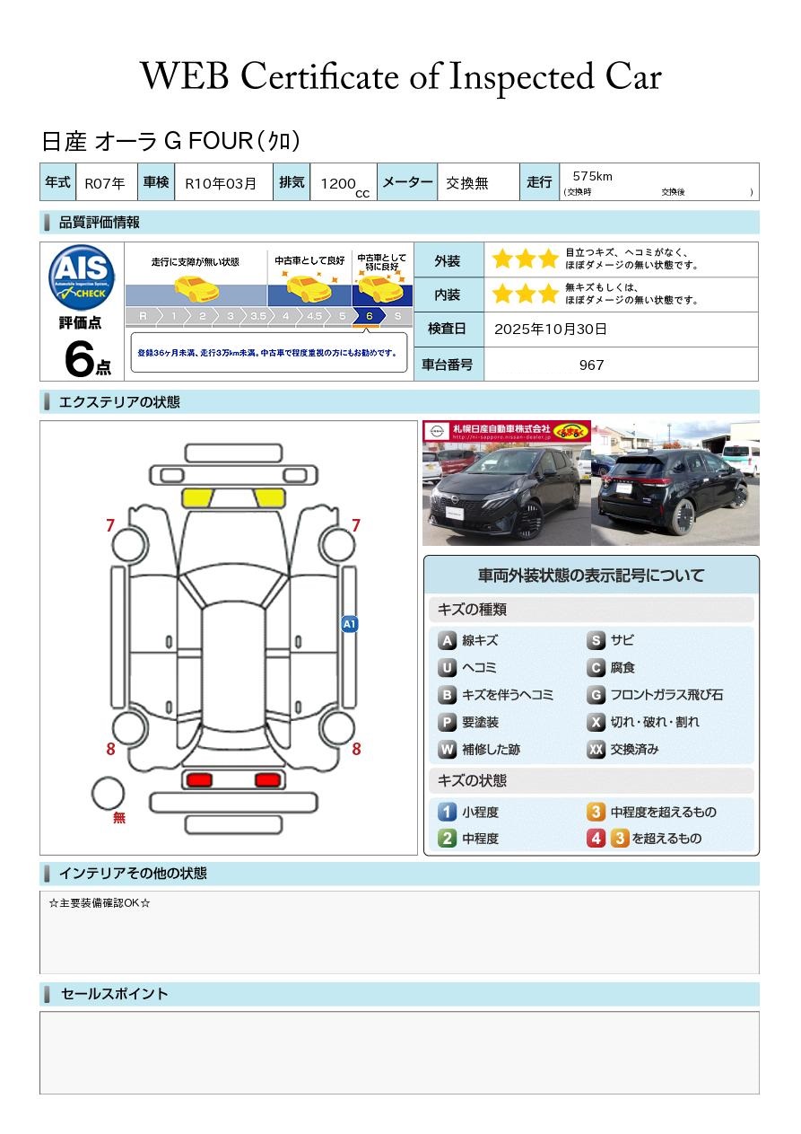 ノートオーラ 1200cc 1.2 G FOUR 4WD 当社社用車アップ 純正メモリーナビ