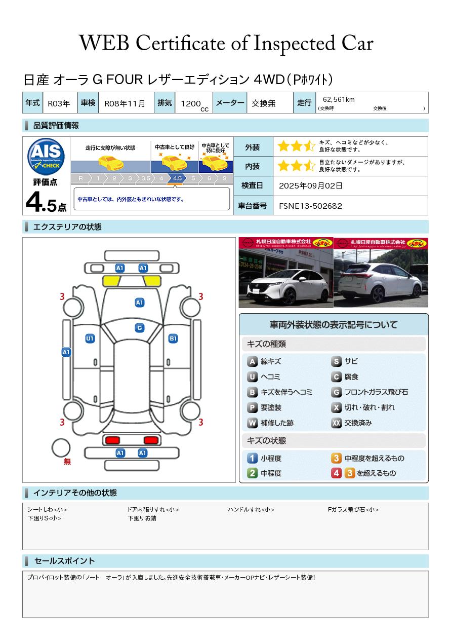 プロパイロット装備の「ノート オーラ」が入庫しました。先進安全技術搭載車・メーカーOPナビ・レザーシート装備!