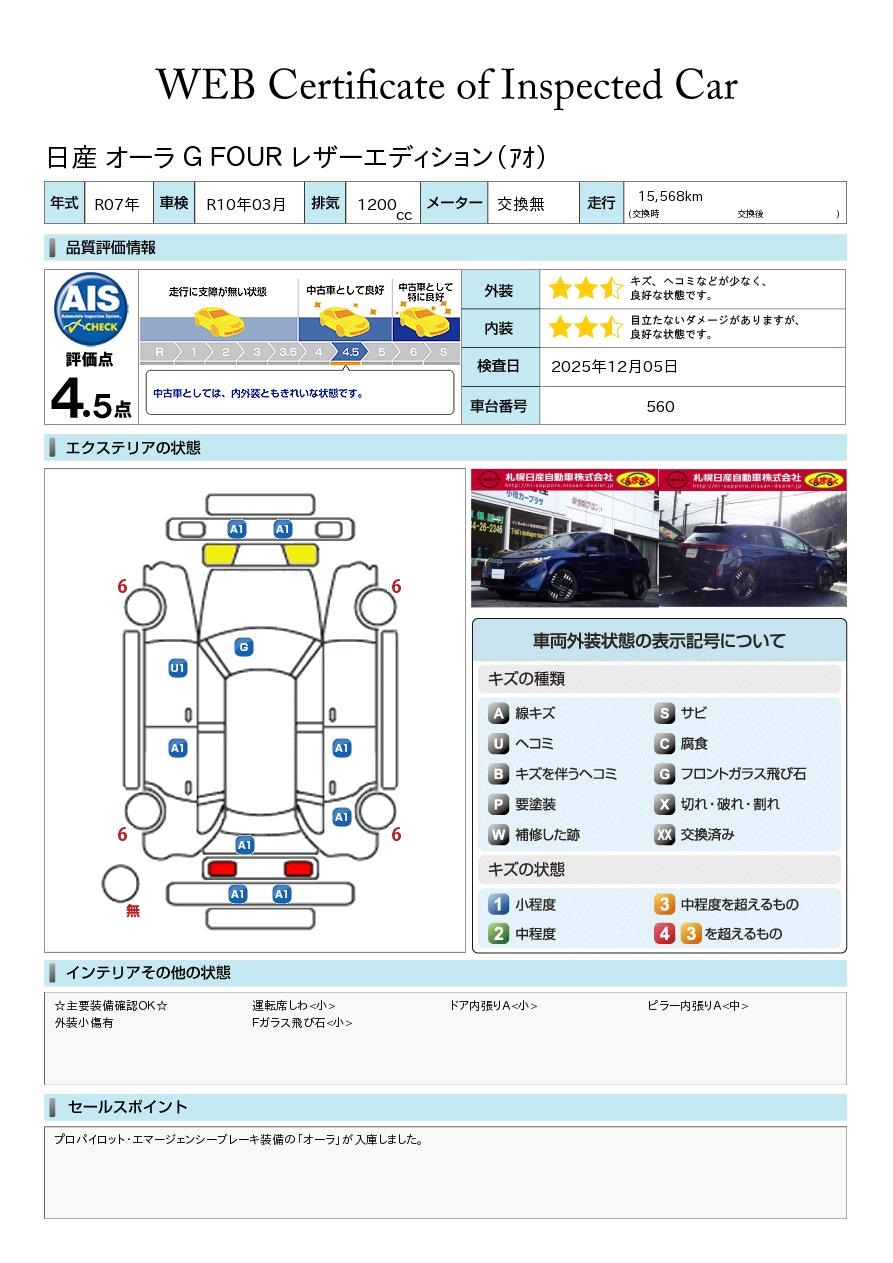 プロパイロット・エマージェンシーブレーキ装備の「オーラ」が入庫しました。アラウンドビューモニター・VDC等先進安全技術搭載車です。当社。社用車UP