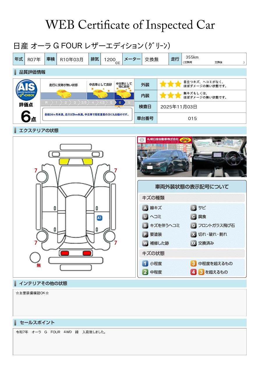 令和7年 オーラ G FOUR 4WD 緑 入荷致しました。スマートミラー SOSコールスイッチ ステアリングヒーター ETC 車線逸脱防止支援システム