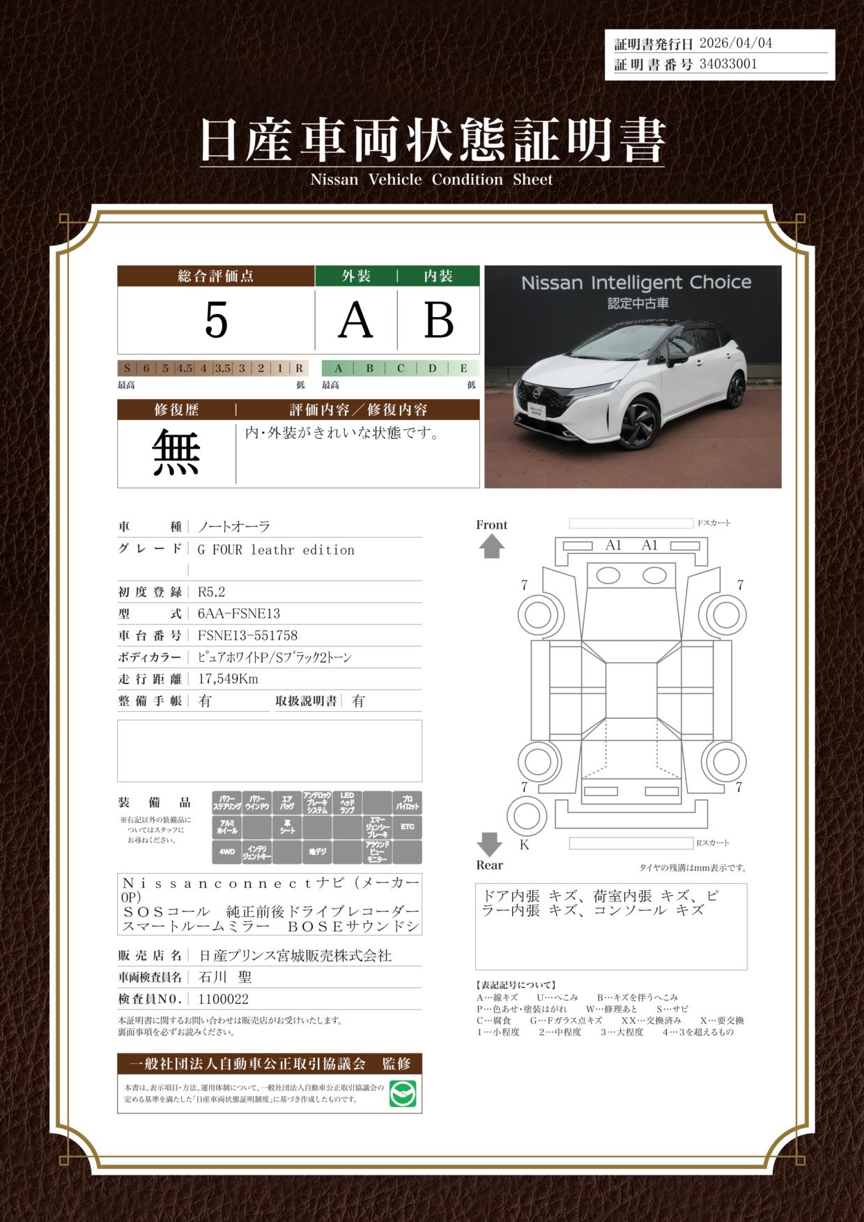 「車両状態証明書」は、査定協会監修のプロの検査員が公正かつ確かな基準で検査した”安心の証”です。