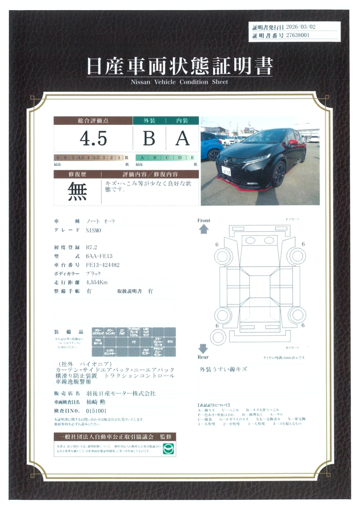 「車両状態証明書」は、査定協会監修のプロの検査員が公正かつ確かな基準で検査した”安心の証”です。