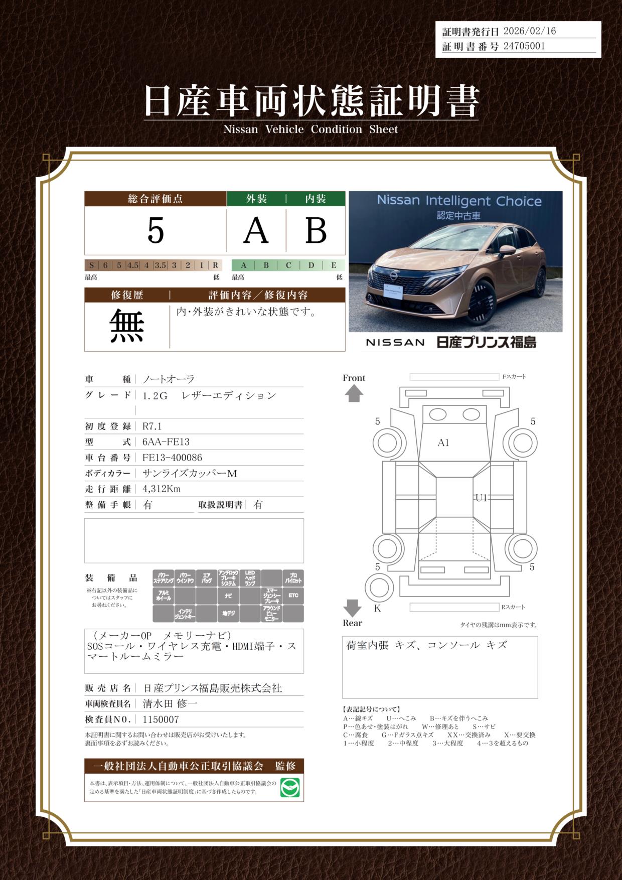 ノートオーラ 1200cc 1.2 G レザーエディション 試乗車 純正大画面ナビ 全周囲カメラ