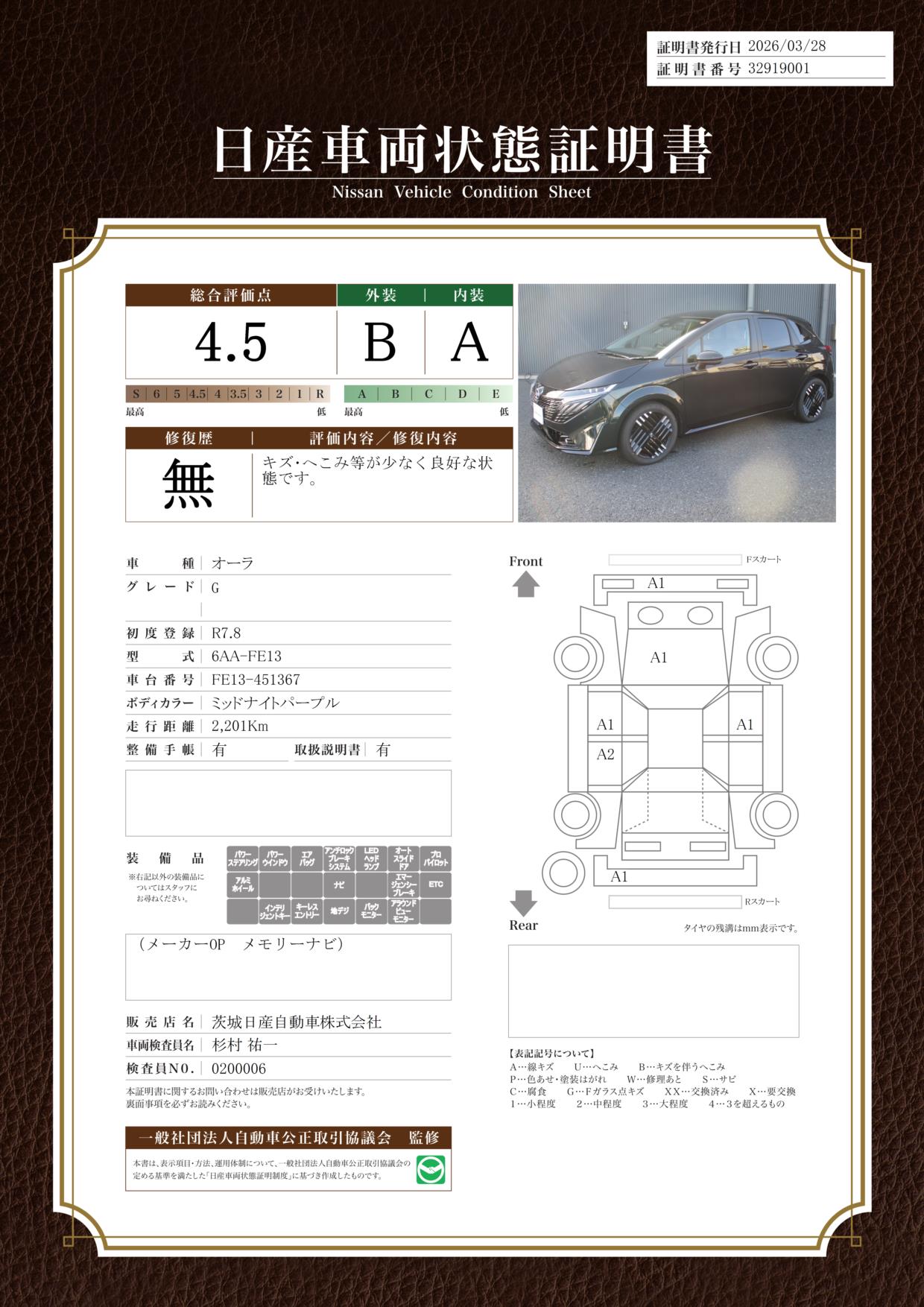 「車両状態証明書」は、査定協会監修のプロの検査員が公正かつ確かな基準で検査した”安心の証”です。