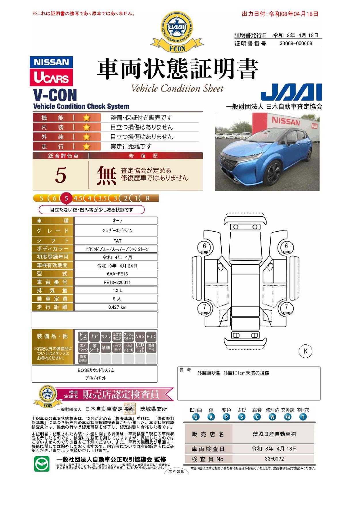 「車両状態証明書」は、査定協会監修のプロの検査員が公正かつ確かな基準で検査した”安心の証”です。