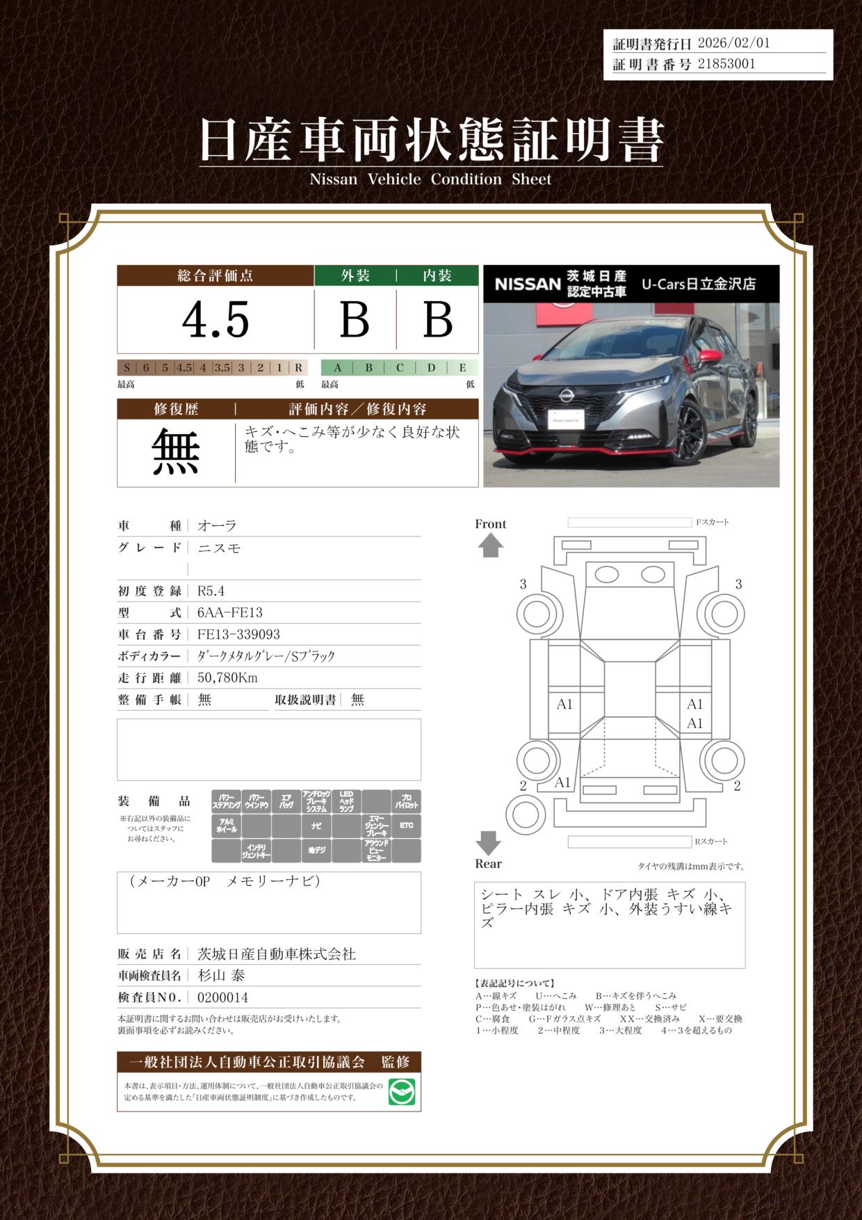 評価機関 : 日産車両状態証明