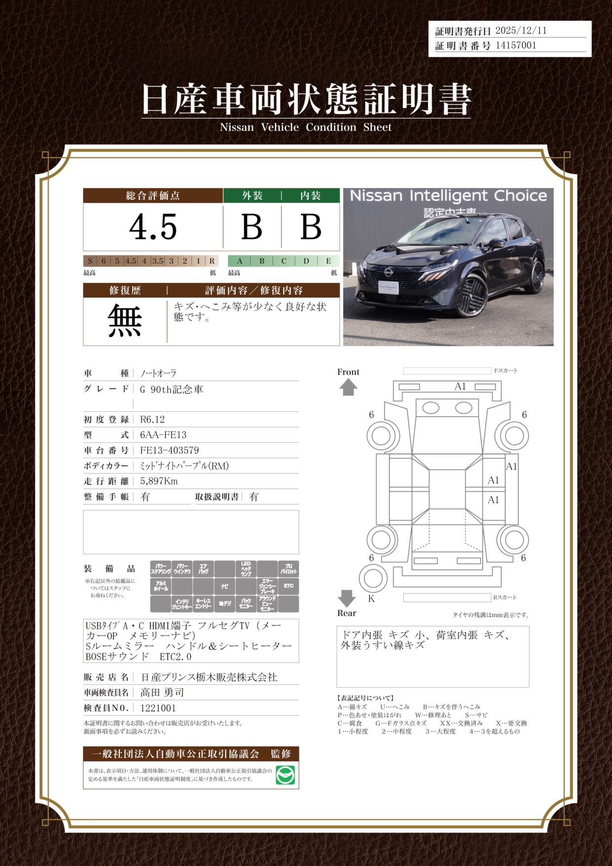 当社使用のノートオーラ入荷しました♪メーカー純正ナビ/BOSE/アラウンドビューモニター/ETC2.0/LEDライト/プロパイ/17インチAW/