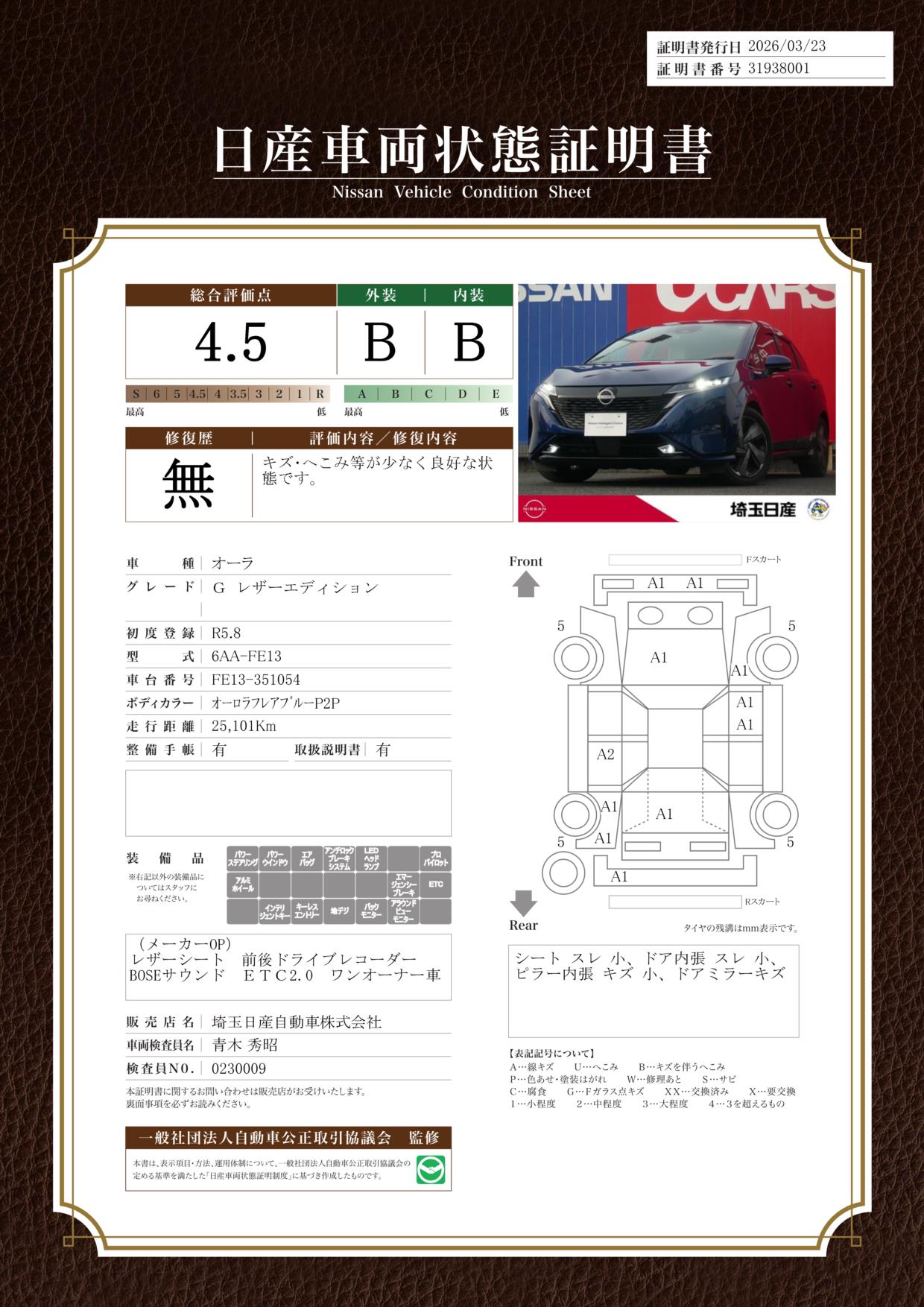 「車両状態証明書」は、査定協会監修のプロの検査員が公正かつ確かな基準で検査した”安心の証”です。