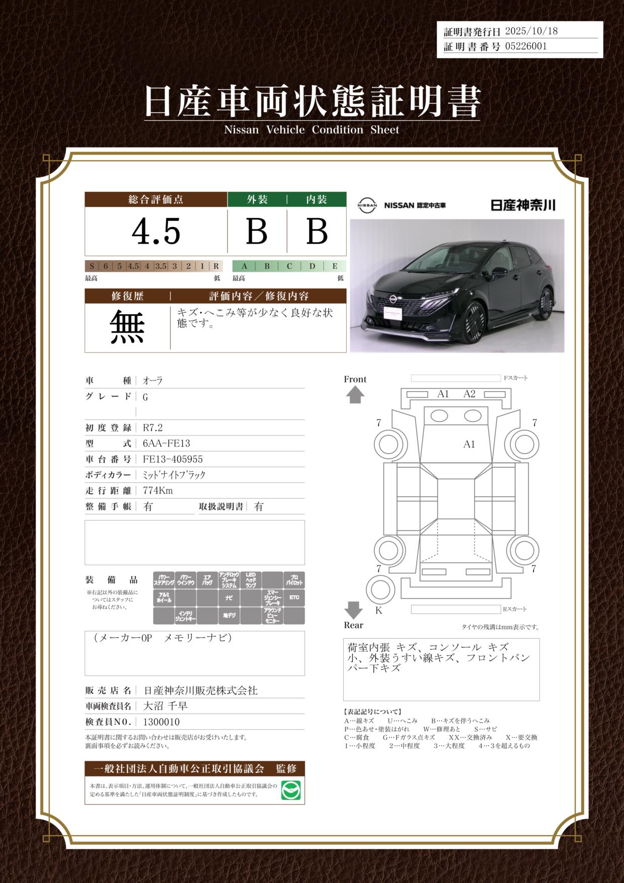 ノートオーラ 1200cc 1.2 G 弊社試乗使用社有車 ドライブレコーダー・