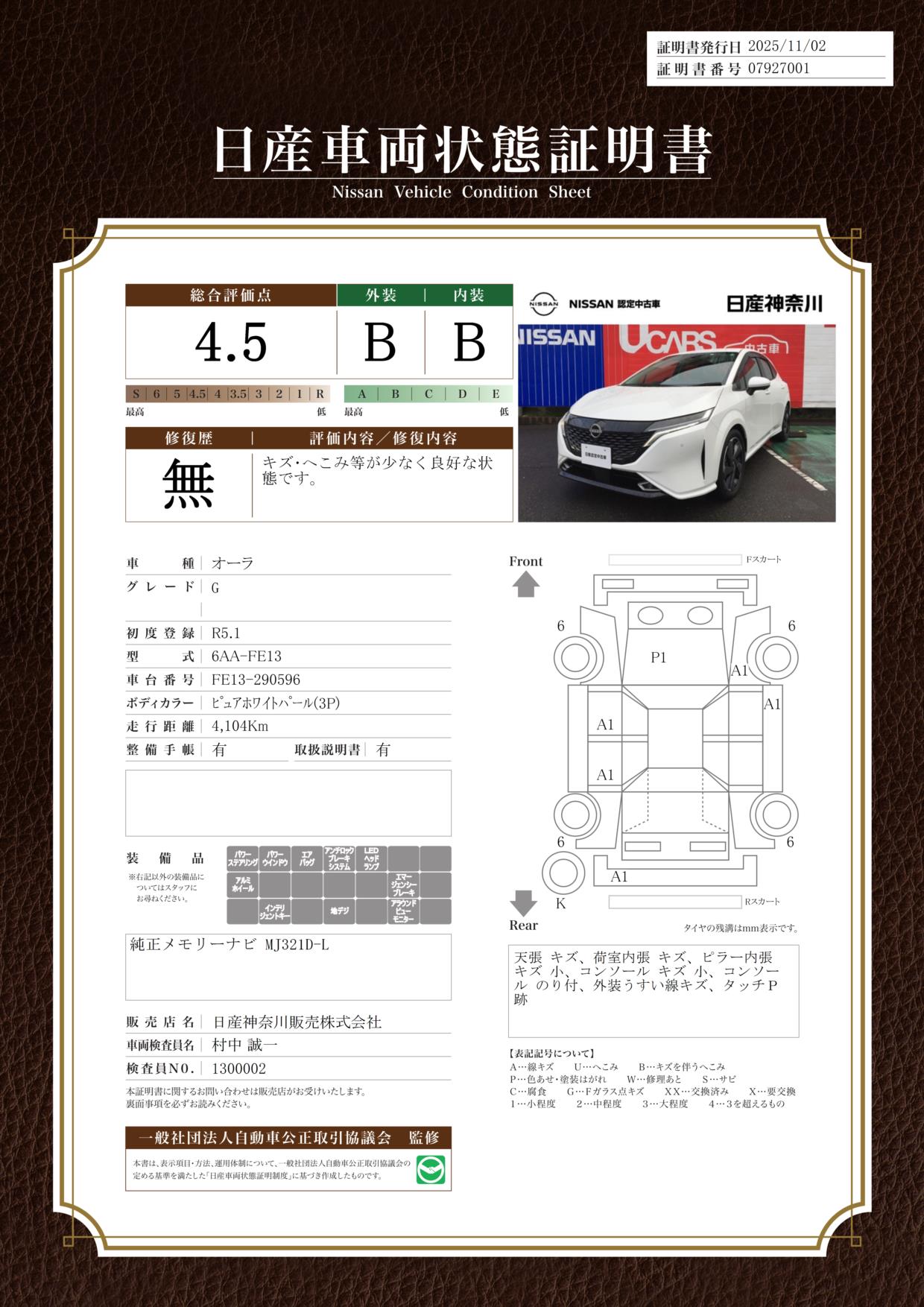 ノートオーラ 1200cc 1.2 G 弊社試乗使用社有車 ドライブレコーダー・
