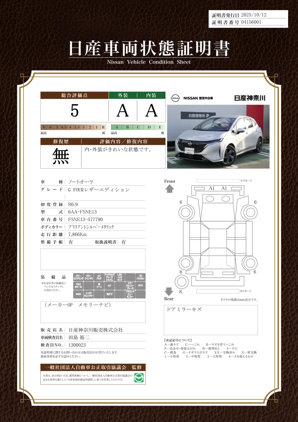 ノートオーラ 1200cc 1.2 G 弊社試乗使用社有車 ドライブレコーダー・