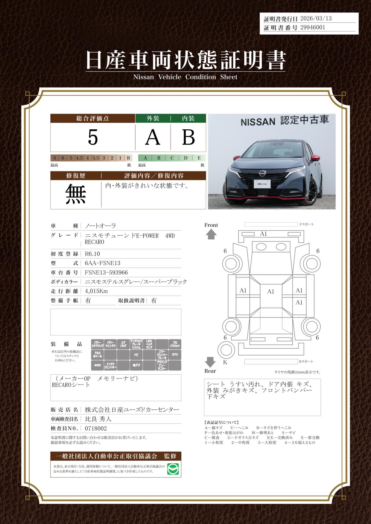 「車両状態証明書」は、査定協会監修のプロの検査員が公正かつ確かな基準で検査した”安心の証”です。