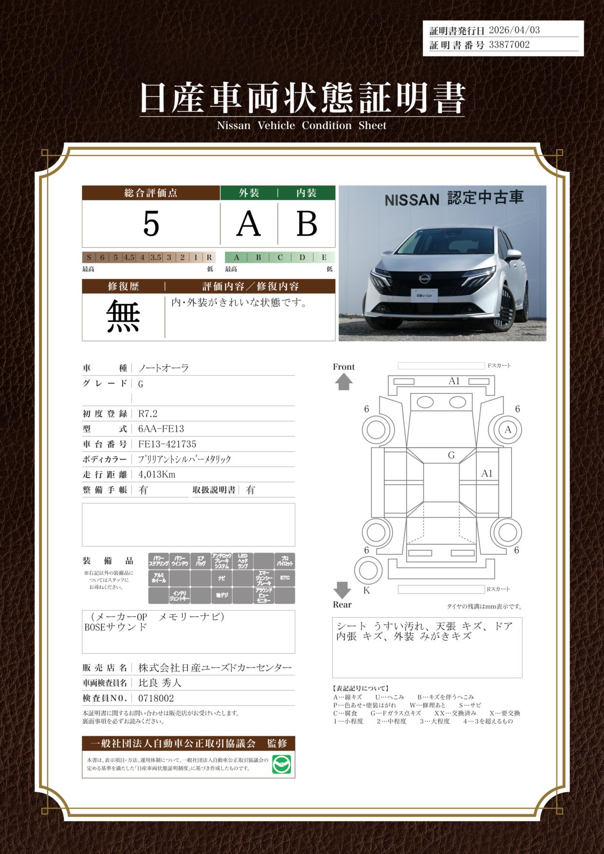 「車両状態証明書」は、査定協会監修のプロの検査員が公正かつ確かな基準で検査した”安心の証”です。