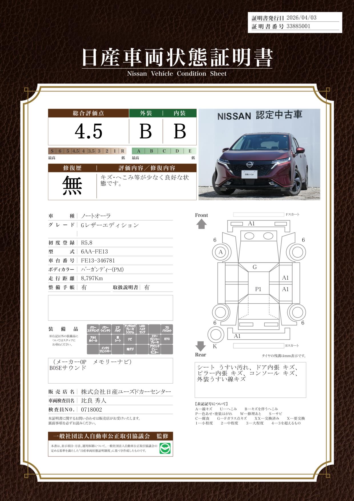 「車両状態証明書」は、査定協会監修のプロの検査員が公正かつ確かな基準で検査した”安心の証”です。