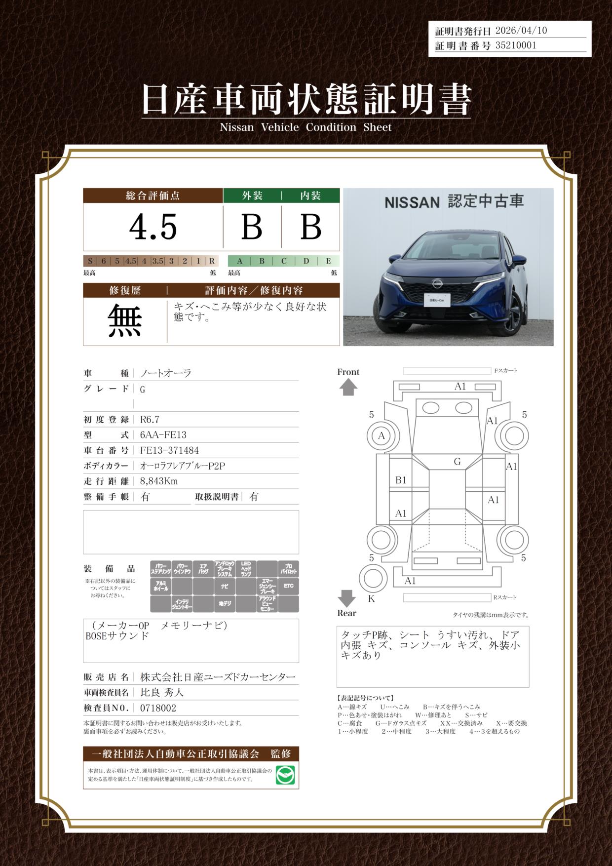 「車両状態証明書」は、査定協会監修のプロの検査員が公正かつ確かな基準で検査した”安心の証”です。