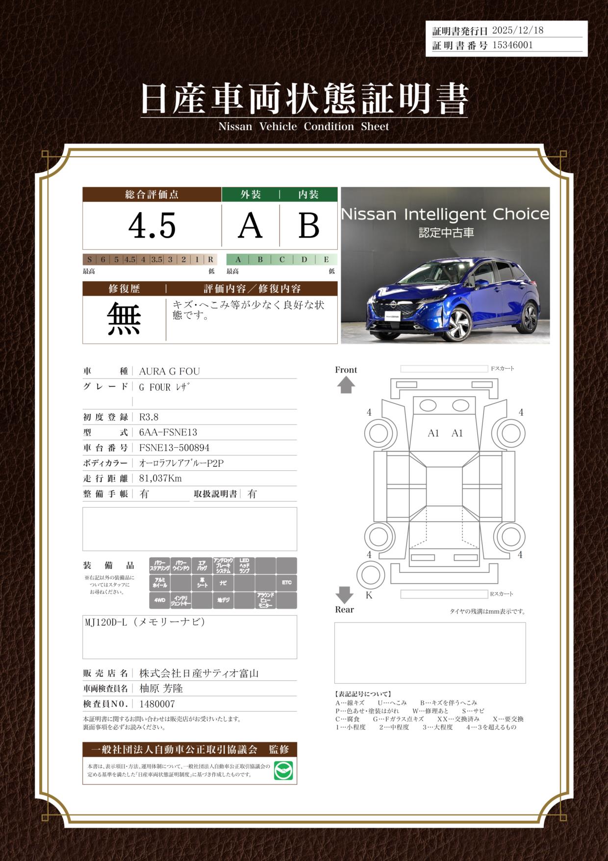 ノートオーラ1.2 G FOUR レザーエディション 4WD 純正デカナビETC