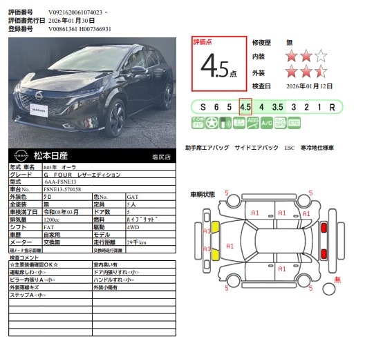 ノートオーラ 1200cc 1.2 G FOUR レザーエディション 4WD 寒冷地仕様 ワイヤレス充電器 ワンオーナー