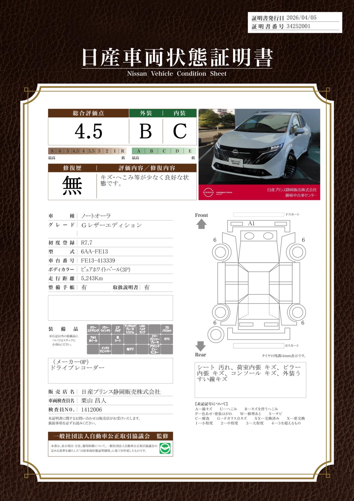 「車両状態証明書」は、査定協会監修のプロの検査員が公正かつ確かな基準で検査した”安心の証”です。