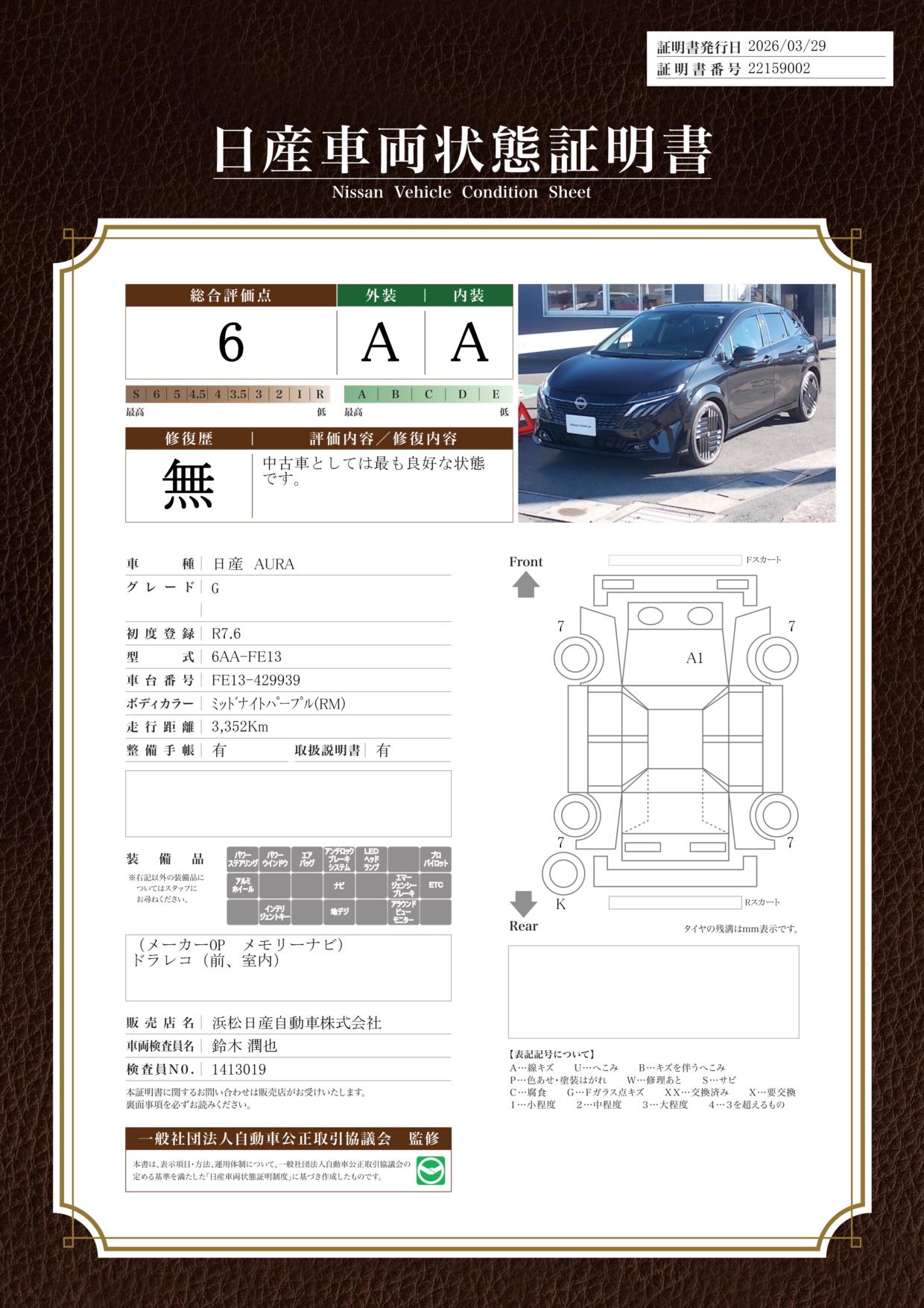 「車両状態証明書」は、査定協会監修のプロの検査員が公正かつ確かな基準で検査した”安心の証”です。