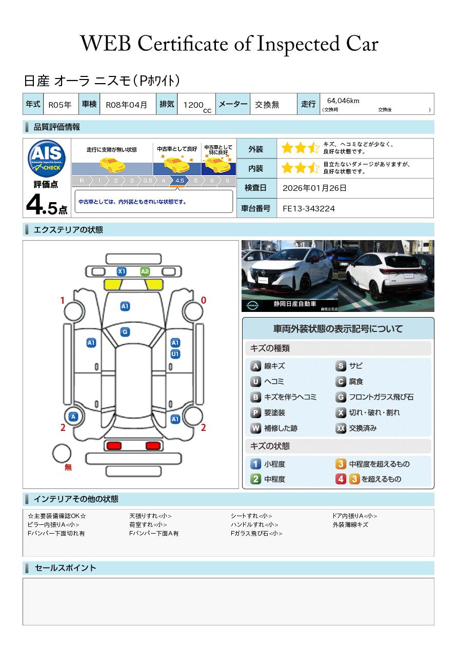 現状括弧書き内の年月まで車検有効期限が残っていますが、ご成約時に新しく車検を取り直します。なお取り直しの費用は車両価格に含まれています。