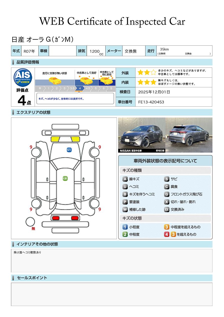 こちらのノートオーラは【雹害車】となります!現車確認をお願いいたします!高品質ノートオーラG!安全装備・先進装備が装着し、室内もきれいな一台!走行35kmで状態良好です。