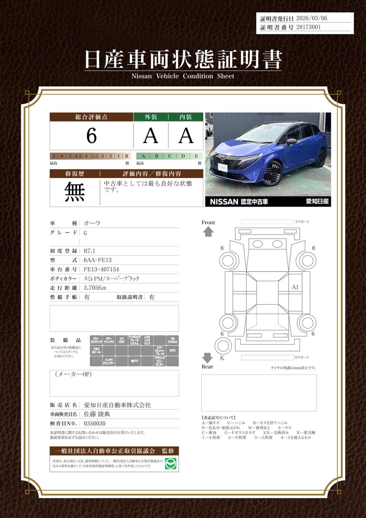 「車両状態証明書」は、査定協会監修のプロの検査員が公正かつ確かな基準で検査した”安心の証”です。