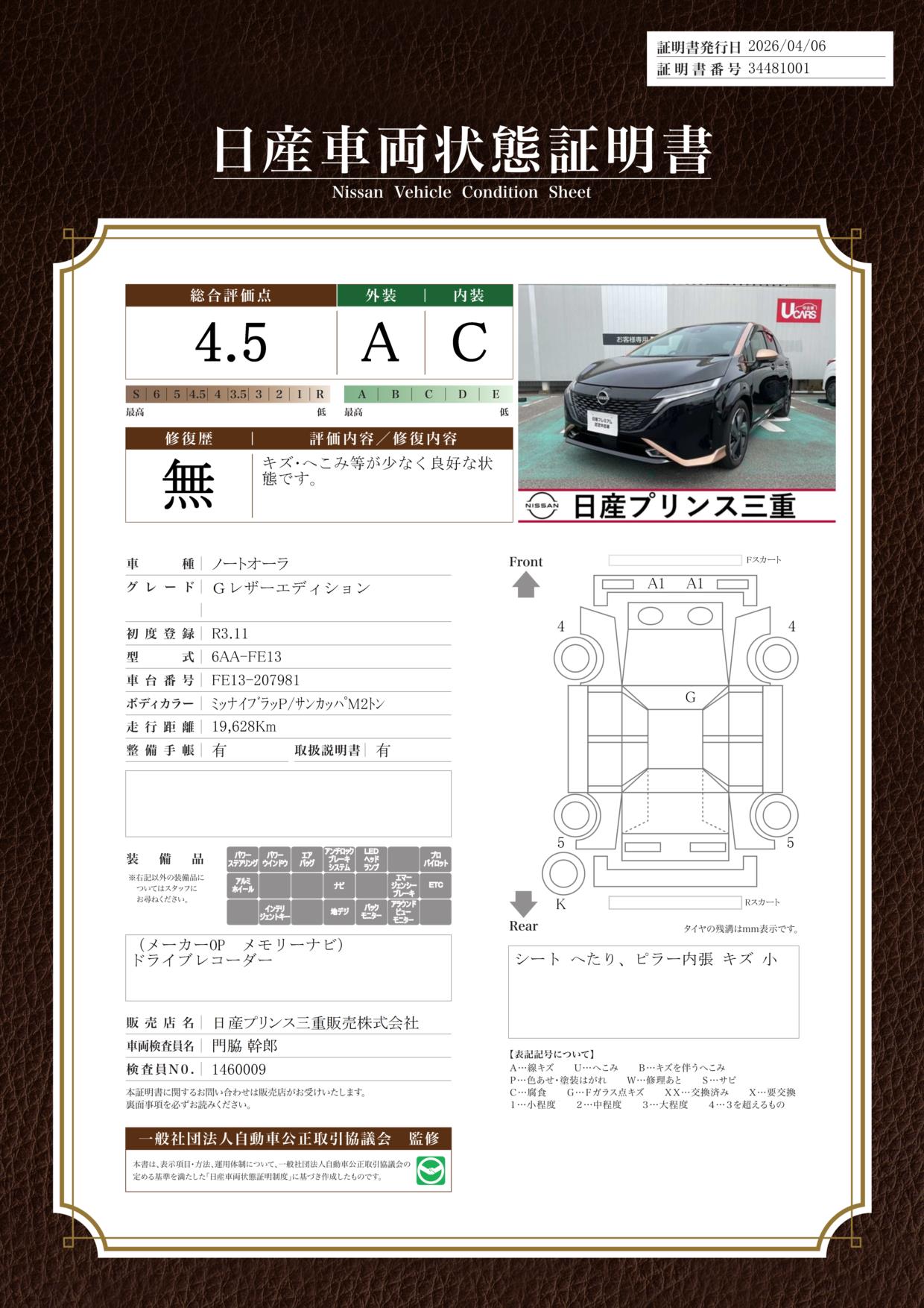 「車両状態証明書」は、査定協会監修のプロの検査員が公正かつ確かな基準で検査した”安心の証”です。