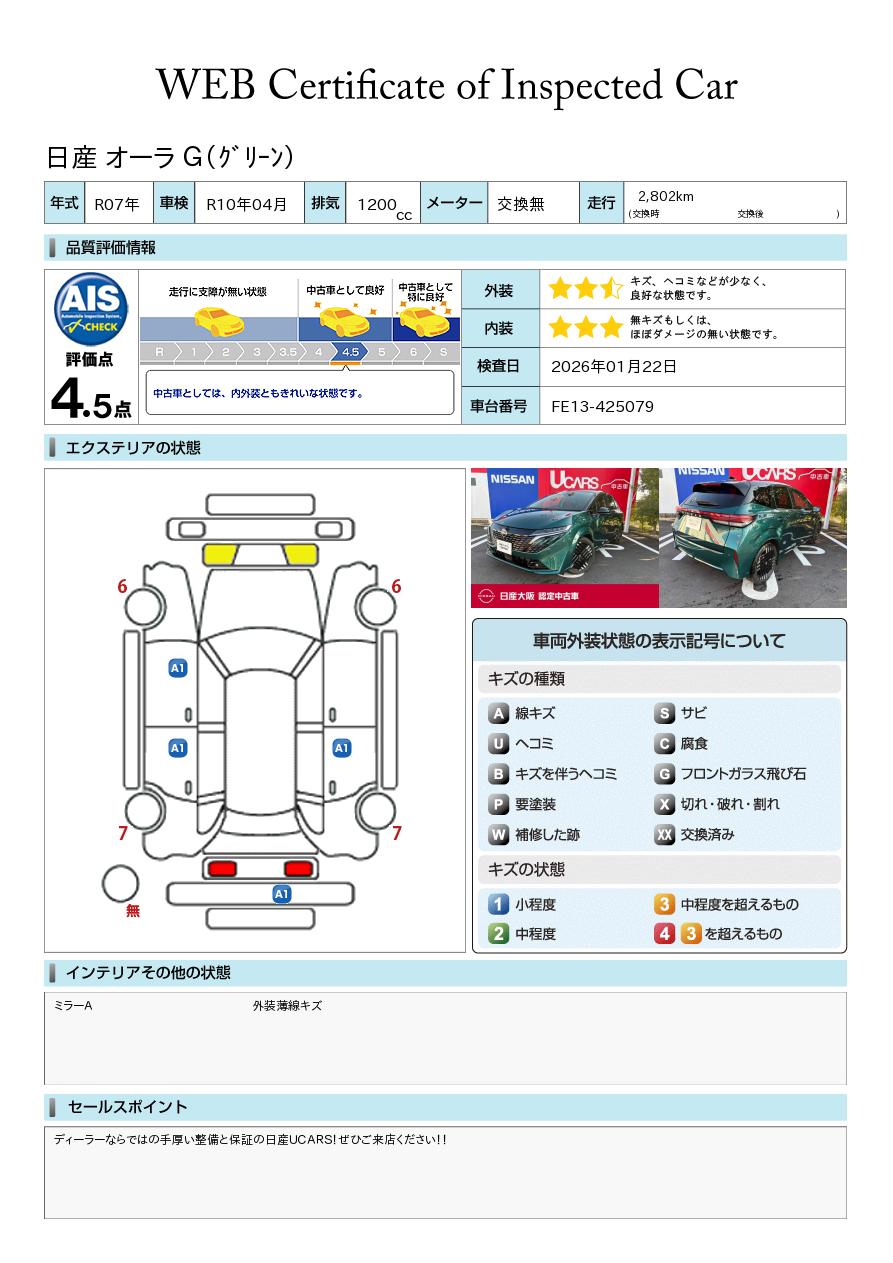 ディーラーならではの手厚い整備と保証の日産UCARS!ぜひご来店ください!!元試乗車のノートオーラです!上質な内装と力強く静かな走り。座り心地の良いシート。オススメですよ!!