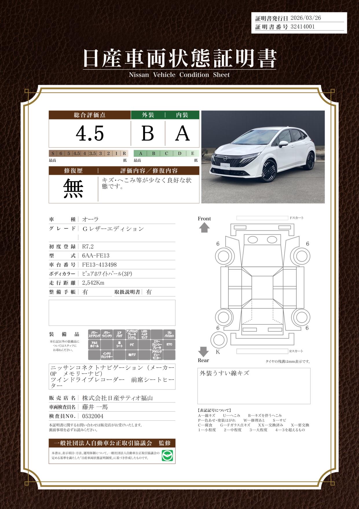 「車両状態証明書」は、査定協会監修のプロの検査員が公正かつ確かな基準で検査した”安心の証”です。