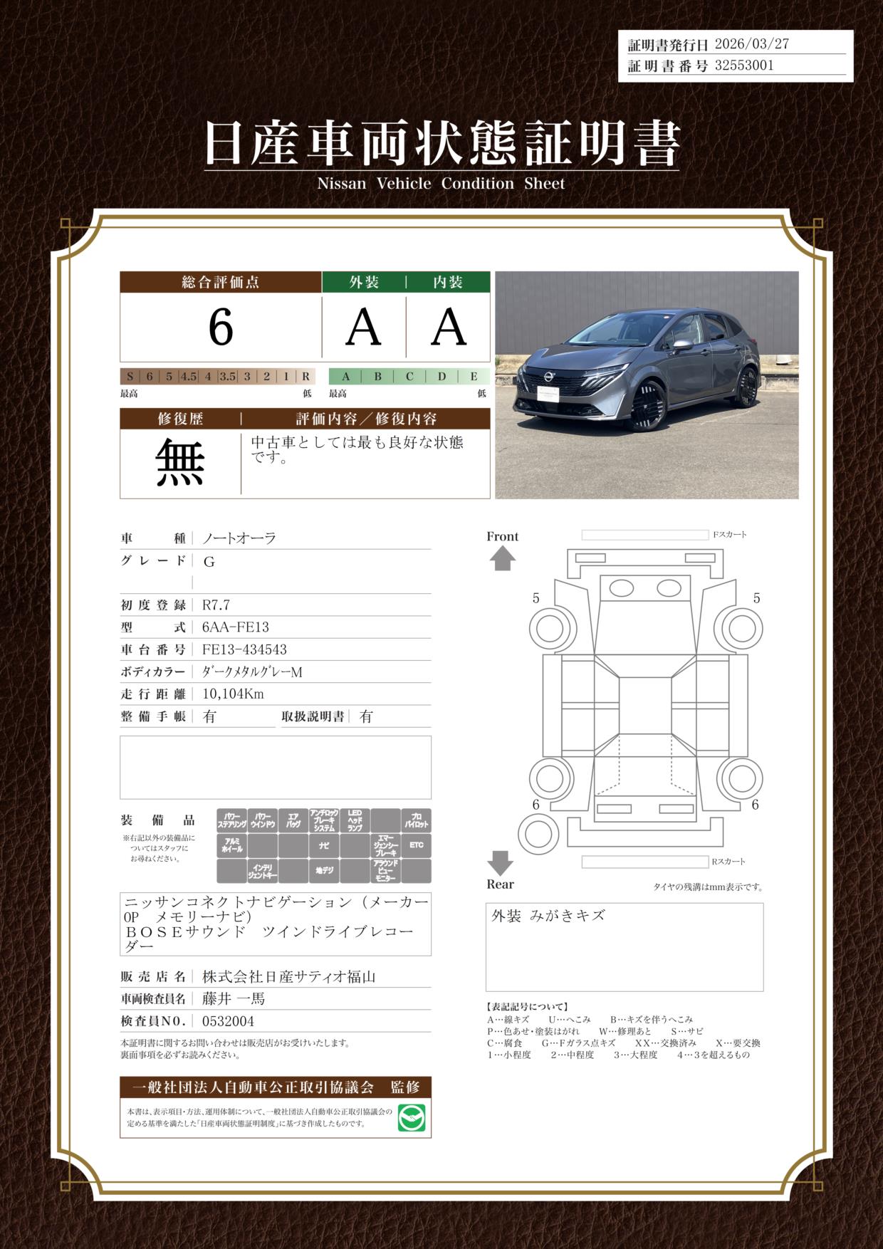 「車両状態証明書」は、査定協会監修のプロの検査員が公正かつ確かな基準で検査した”安心の証”です。