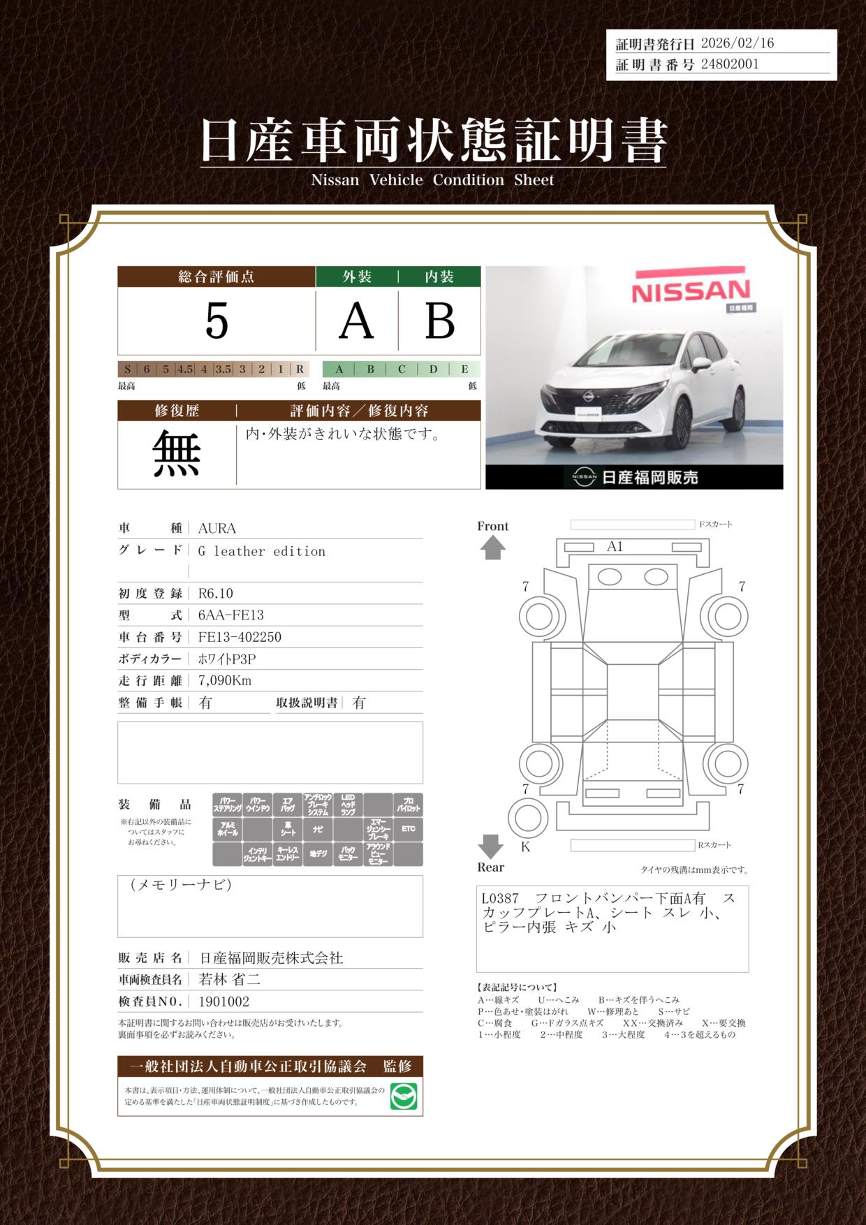 「車両状態証明書」は、査定協会監修のプロの検査員が公正かつ確かな基準で検査した”安心の証”です。