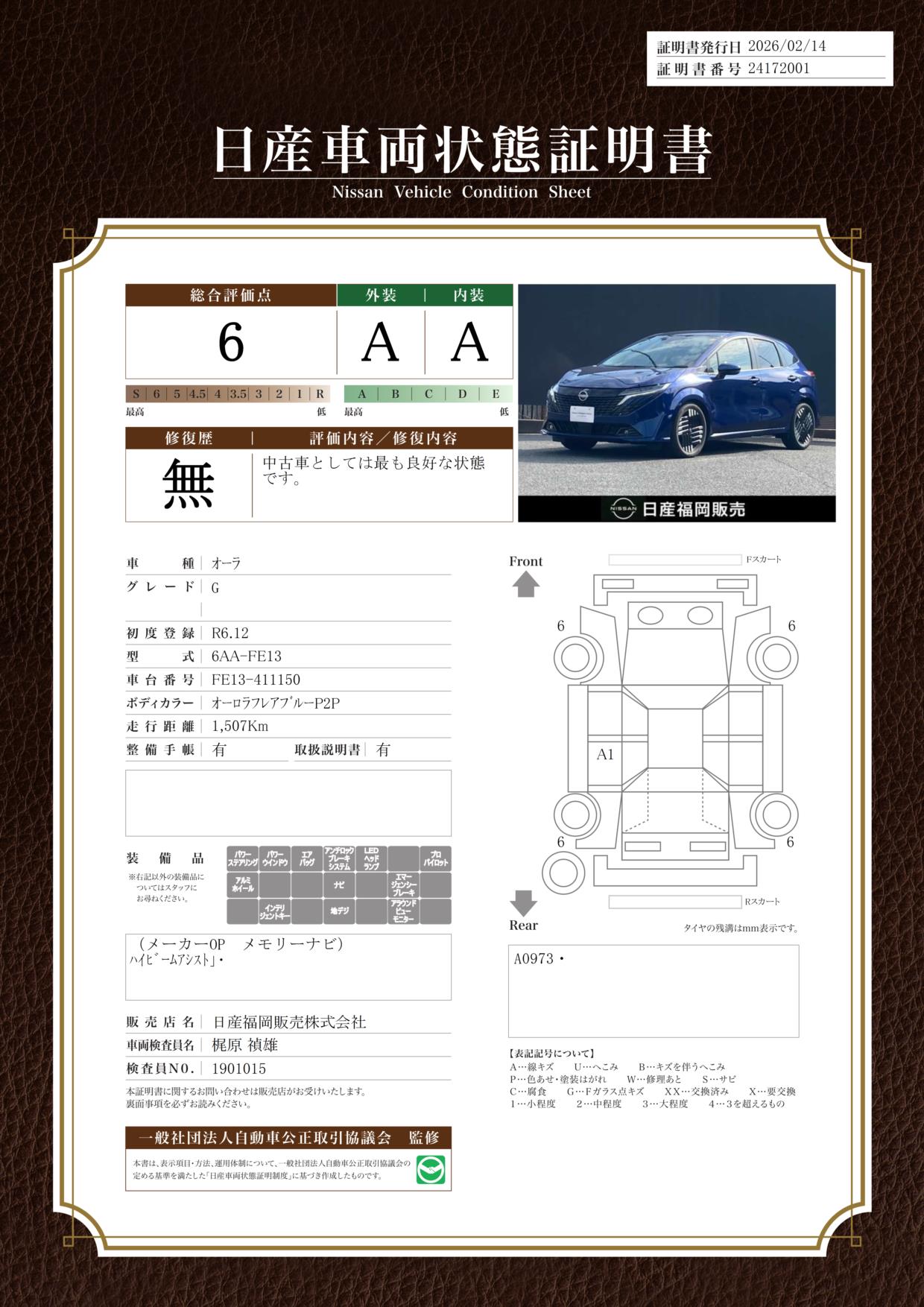 「車両状態証明書」は、査定協会監修のプロの検査員が公正かつ確かな基準で検査した”安心の証”です。