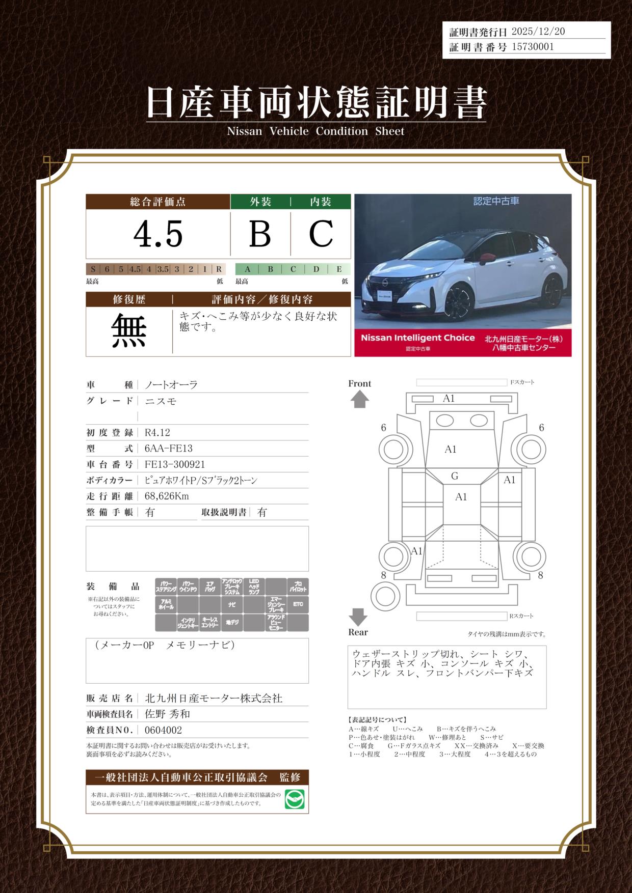 日産 ノートAURA NISMO 入荷!車検整備渡・日産ワイド保証・純正ナビ・全周囲カメラ・衝突軽減・横滑防止・踏間違防止・プロパイロット・ETC・シートヒーター
