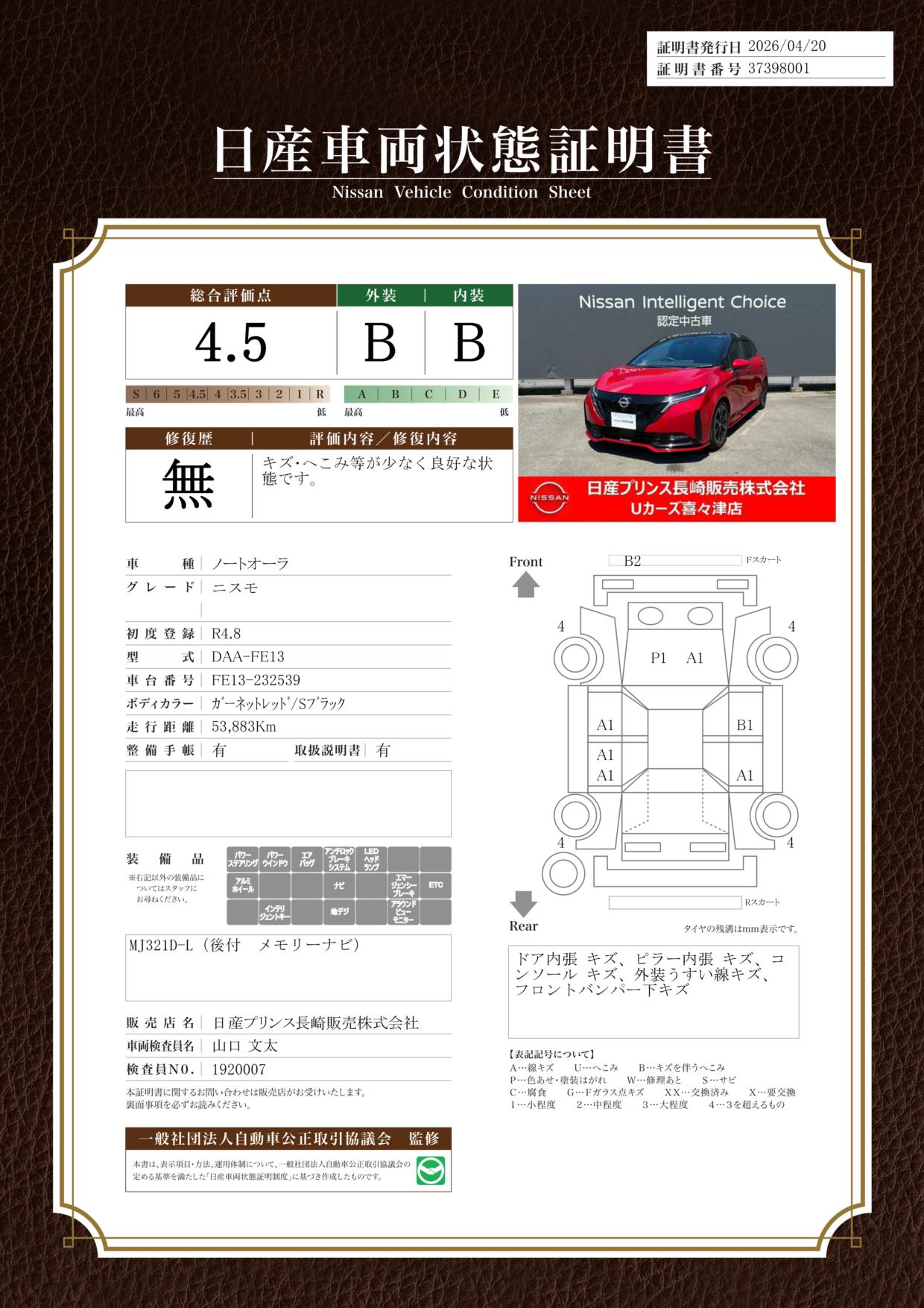 現状括弧書き内の年月まで車検有効期限が残っていますが、ご成約時に新しく車検を取り直します。なお取り直しの費用は車両価格に含まれています。