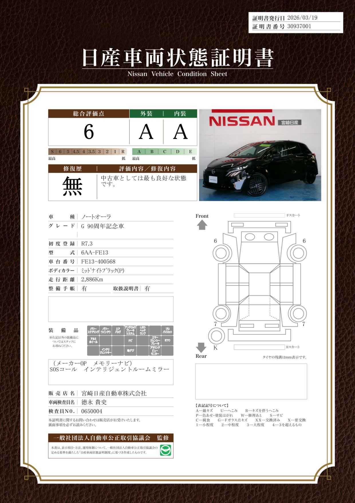 「車両状態証明書」は、査定協会監修のプロの検査員が公正かつ確かな基準で検査した”安心の証”です。