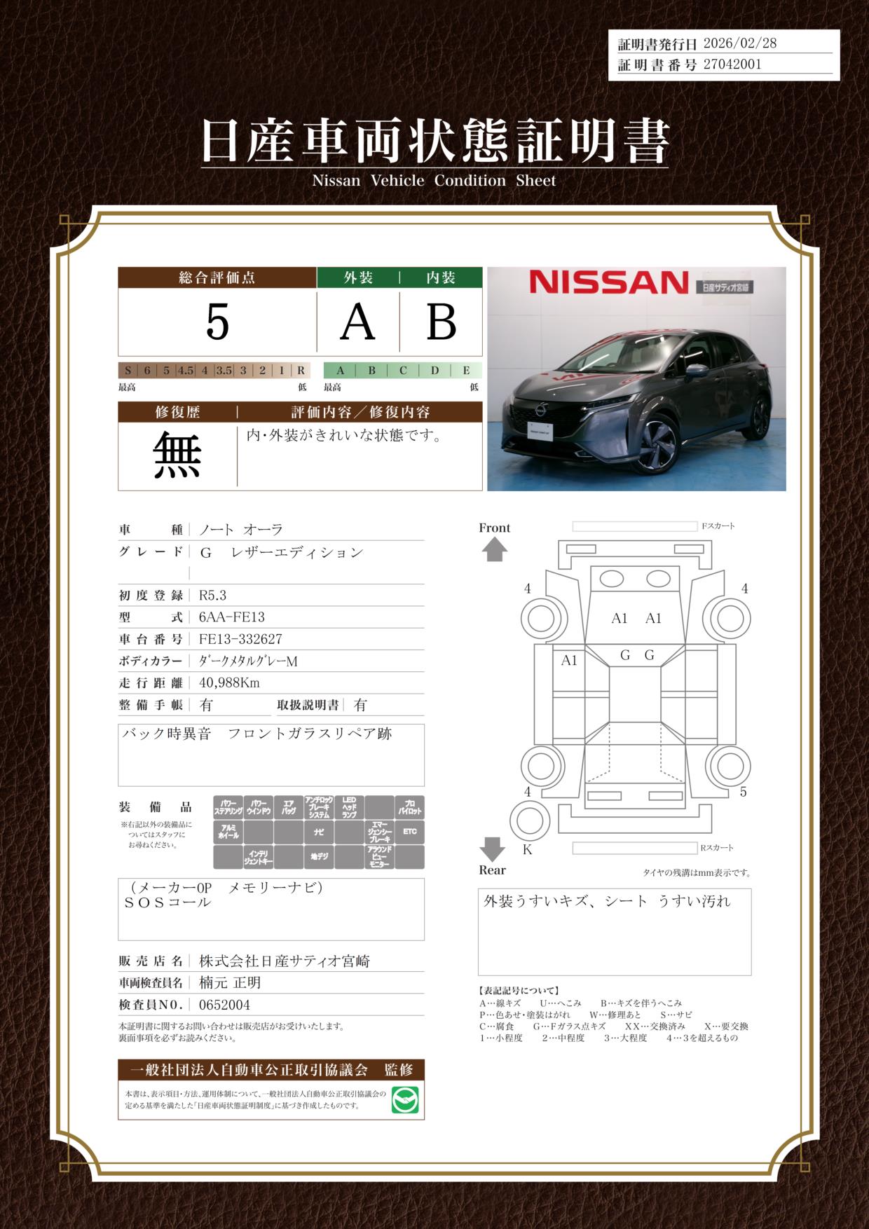 「車両状態証明書」は、査定協会監修のプロの検査員が公正かつ確かな基準で検査した”安心の証”です。