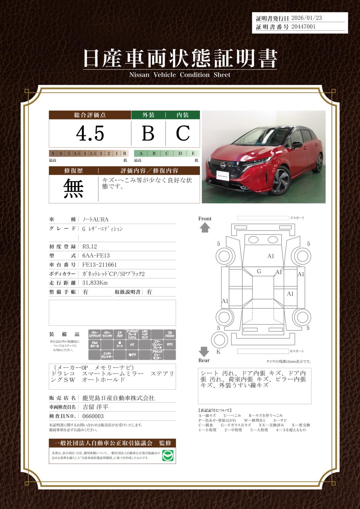 現状括弧書き内の年月まで車検有効期限が残っていますが、ご成約時に新しく車検を取り直します。なお取り直しの費用は車両価格に含まれています。