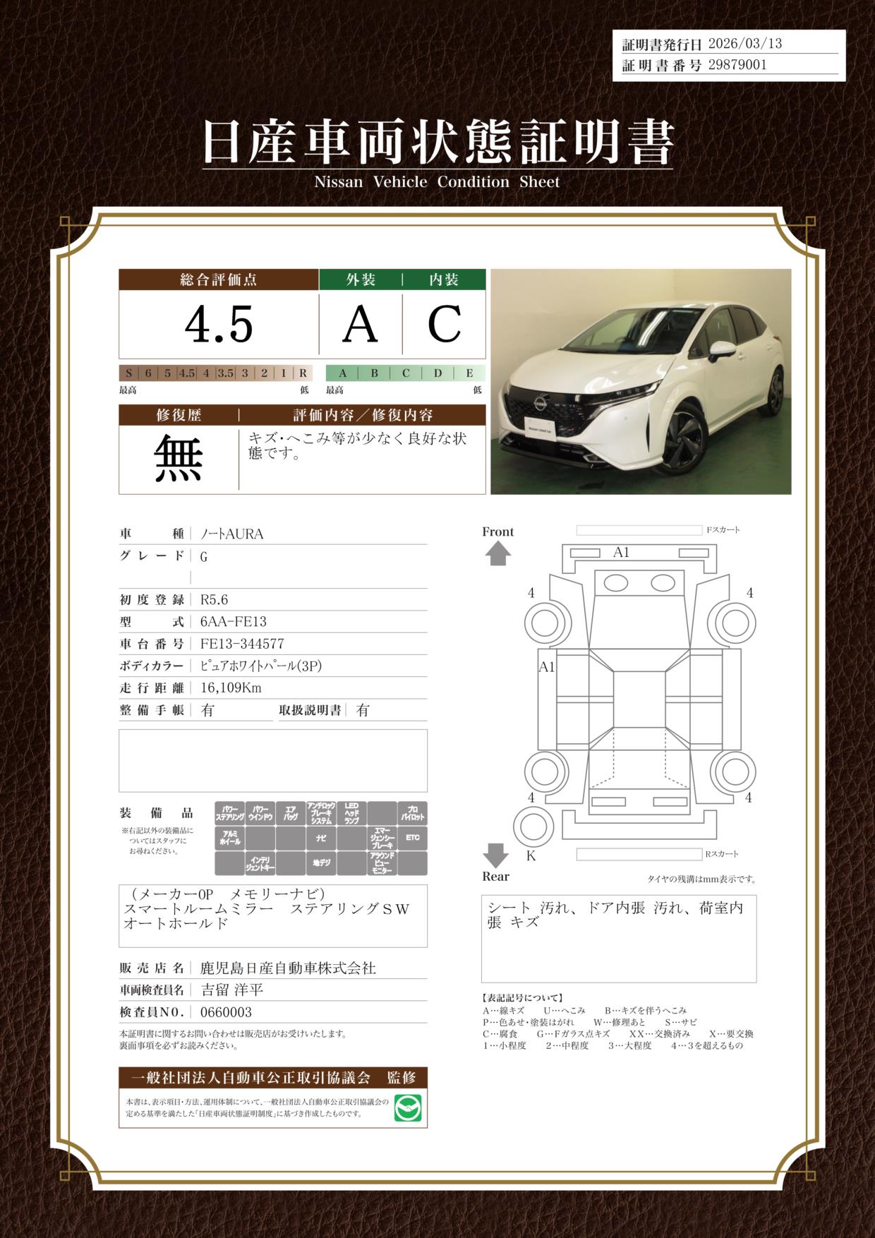 「車両状態証明書」は、査定協会監修のプロの検査員が公正かつ確かな基準で検査した”安心の証”です。