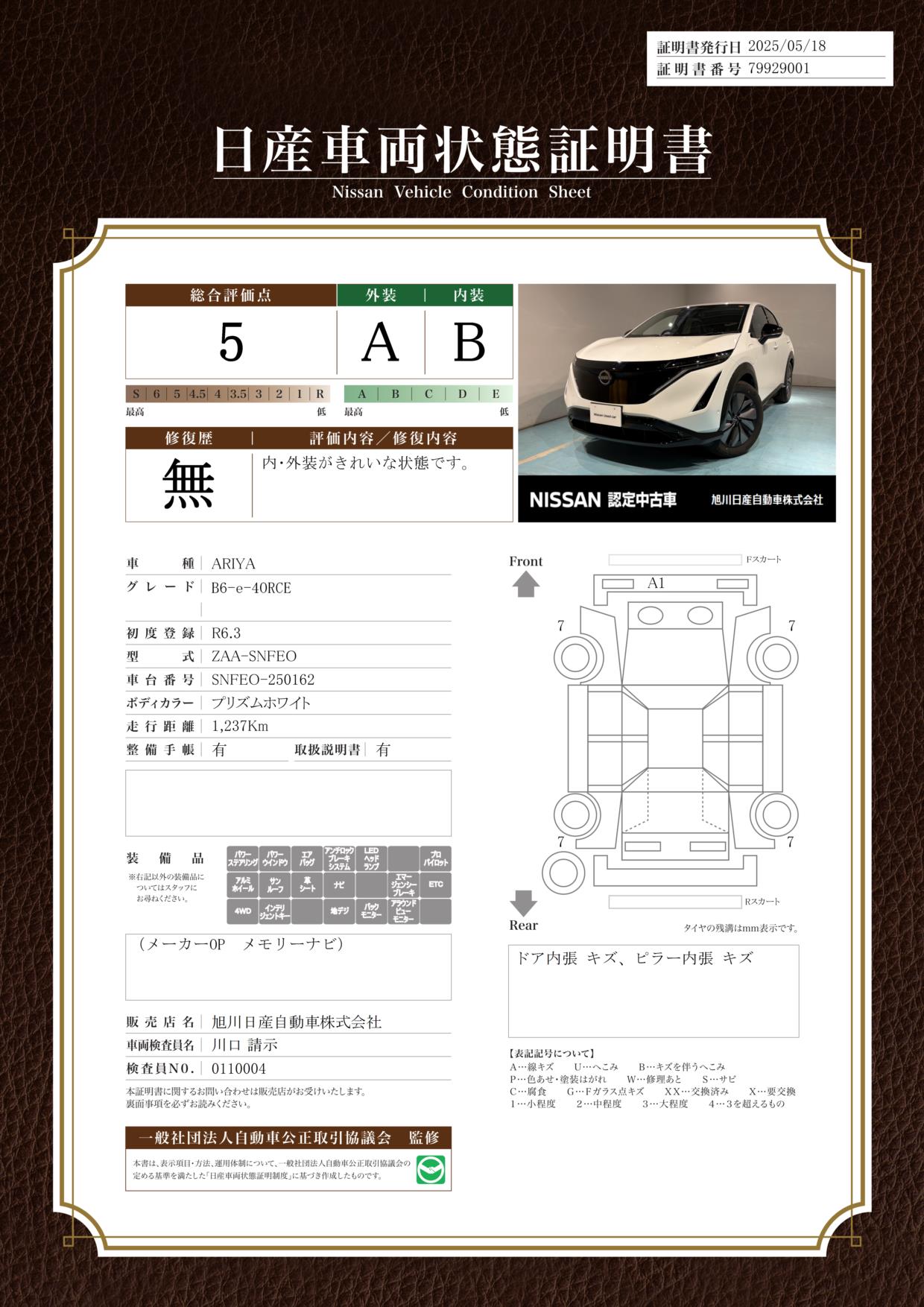 評価機関 : 日産車両状態証明