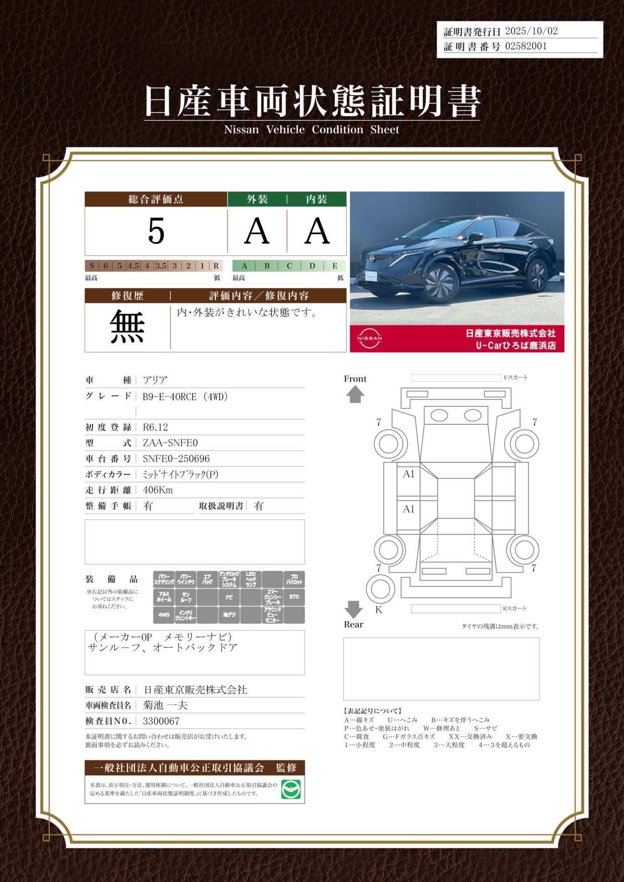 アリア B9 e-4ORCE 4WD 当社社有車 プロパイロット2.0 サンルーフ