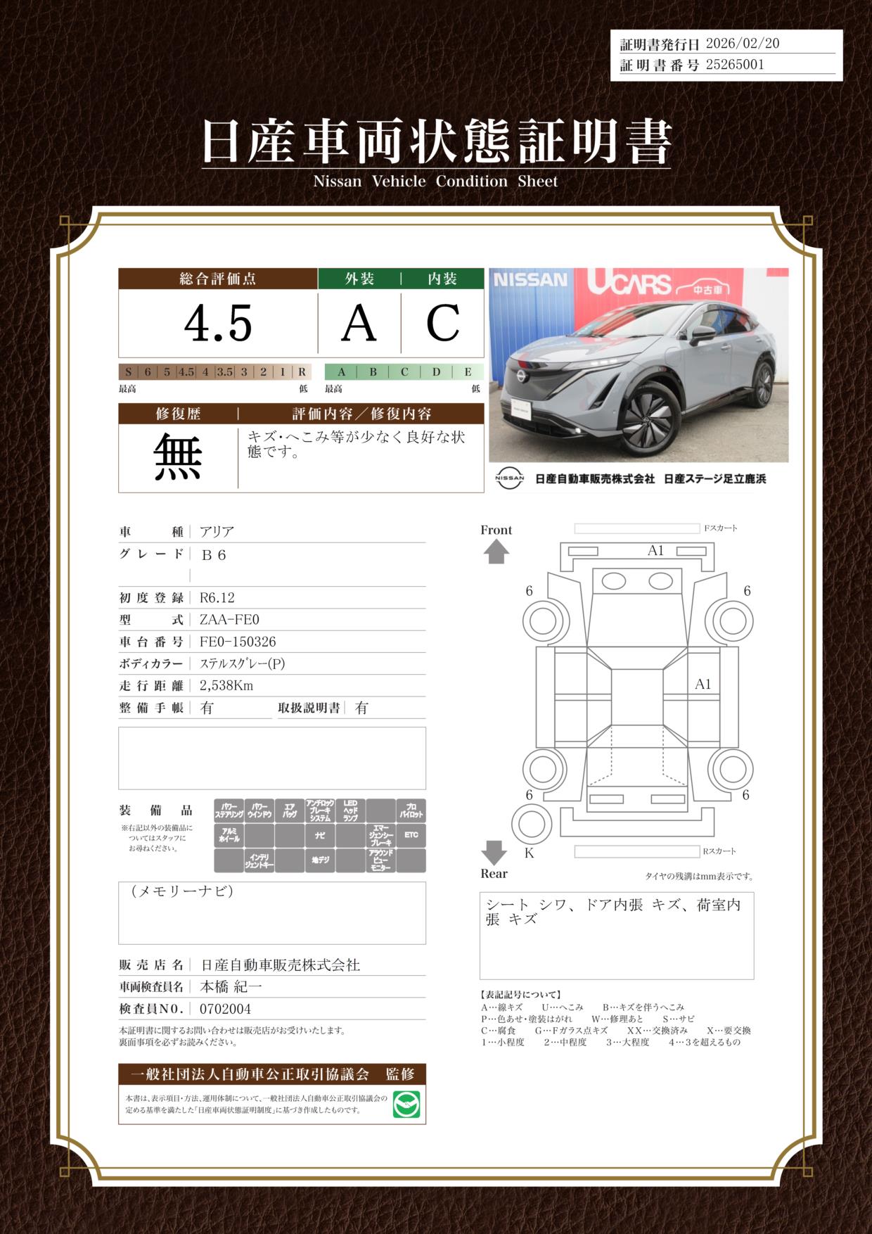 「車両状態証明書」は、査定協会監修のプロの検査員が公正かつ確かな基準で検査した”安心の証”です。