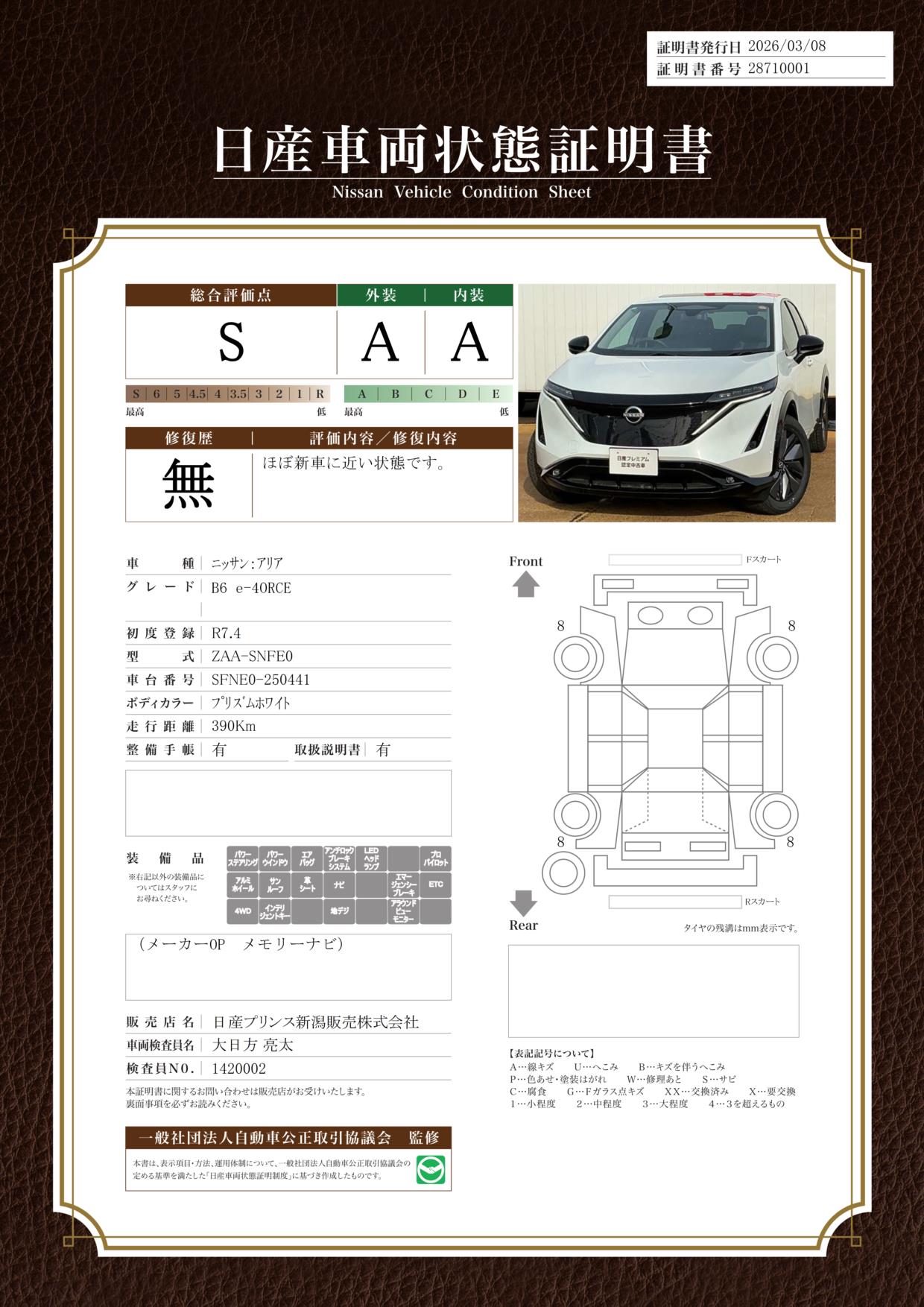「車両状態証明書」は、査定協会監修のプロの検査員が公正かつ確かな基準で検査した”安心の証”です。
