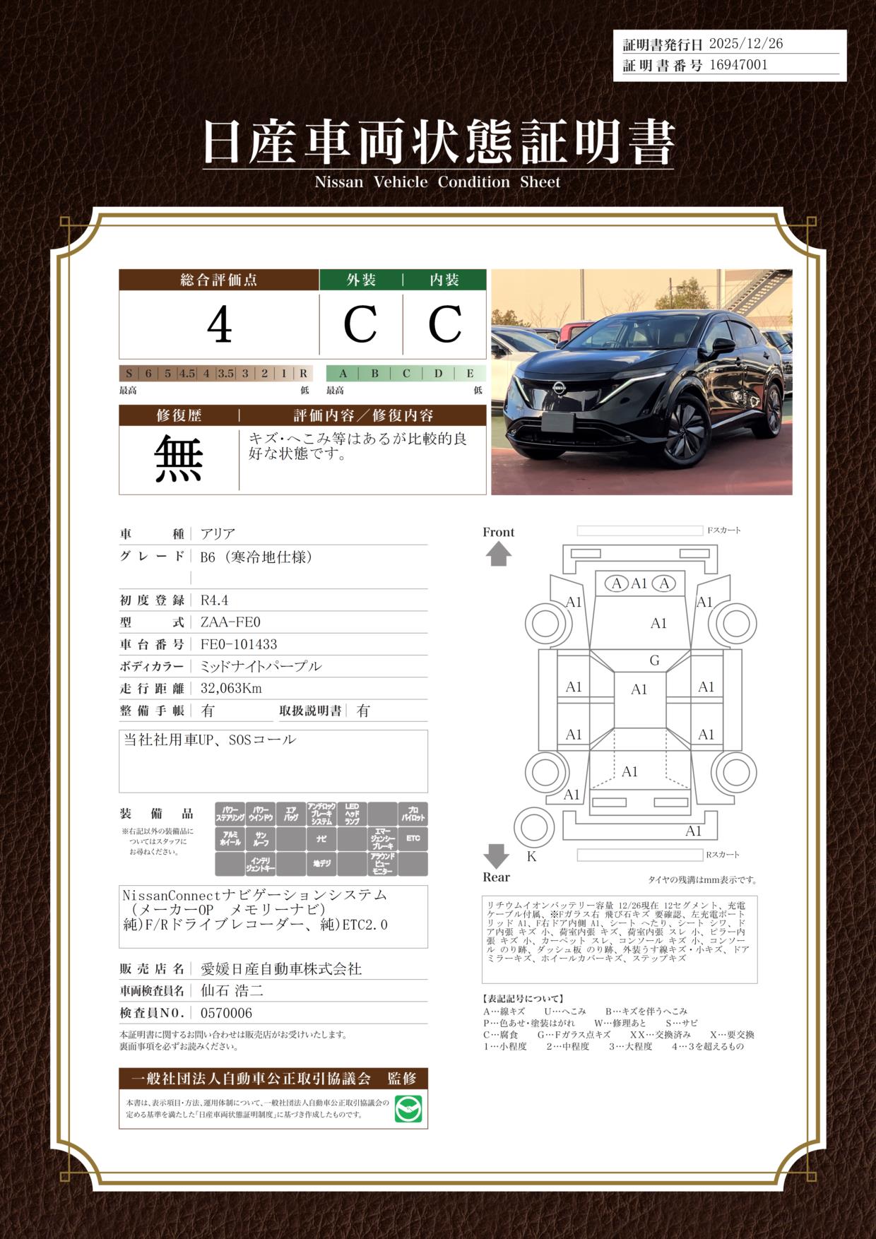評価機関 : 日産車両状態証明