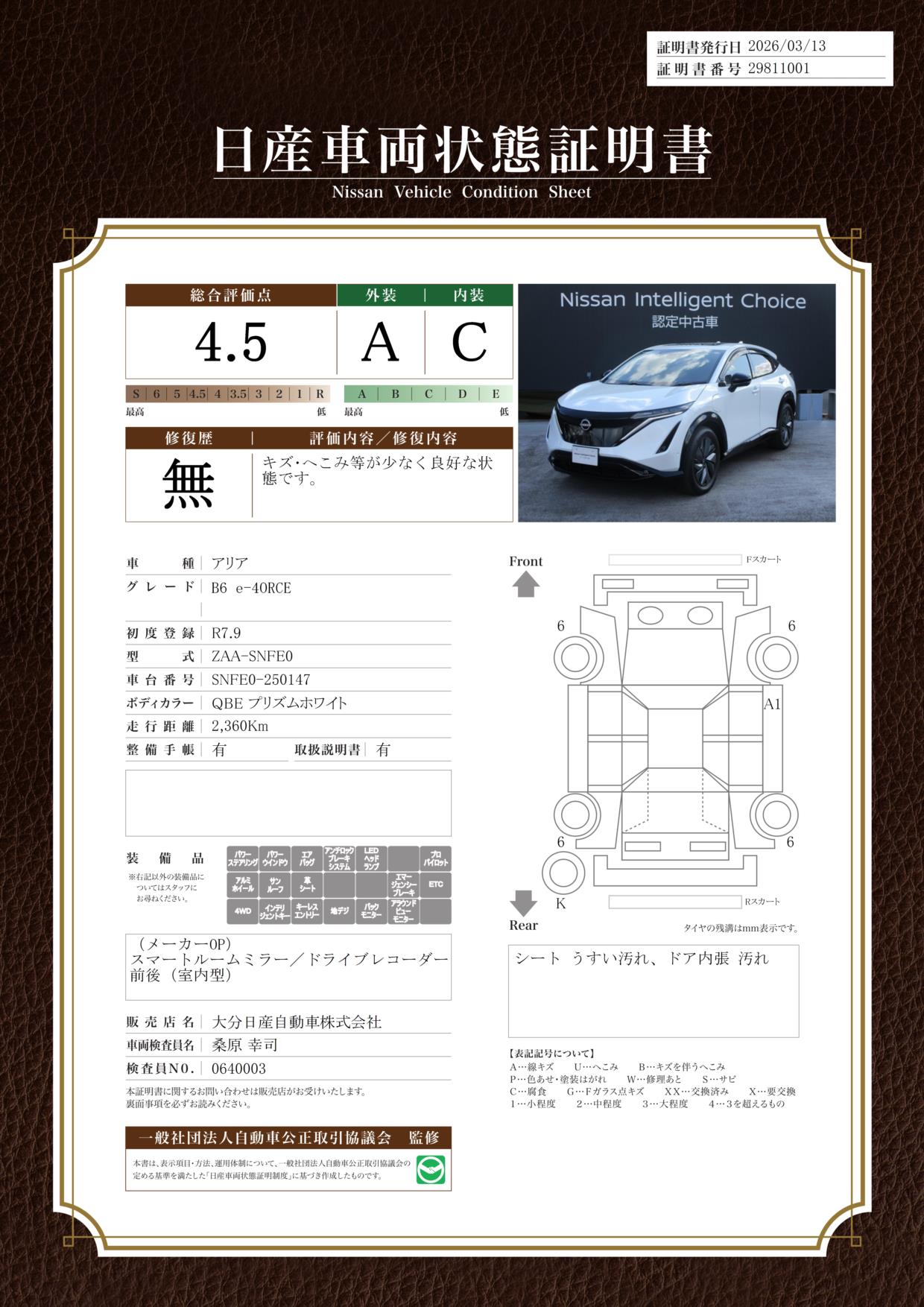 「車両状態証明書」は、査定協会監修のプロの検査員が公正かつ確かな基準で検査した”安心の証”です。
