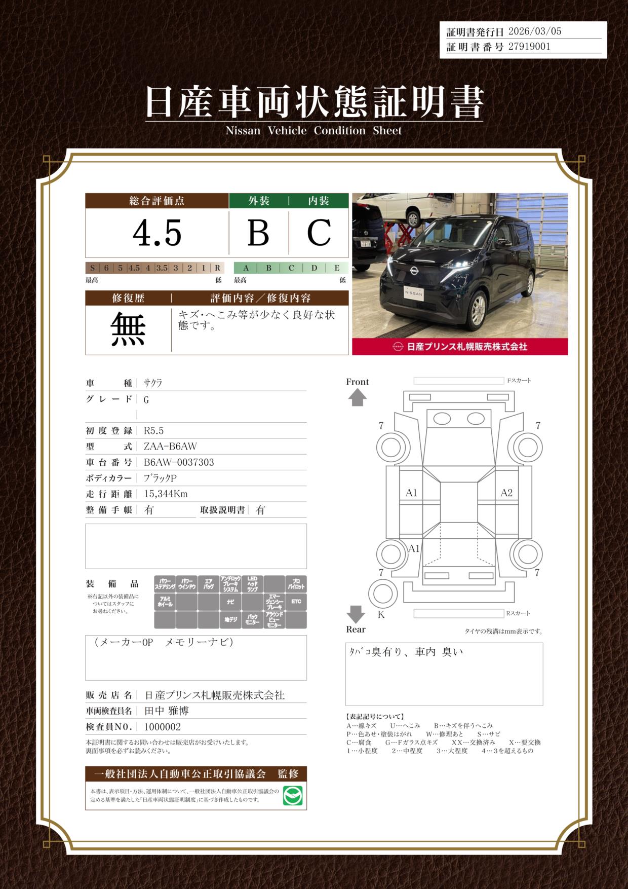 「車両状態証明書」は、査定協会監修のプロの検査員が公正かつ確かな基準で検査した”安心の証”です。