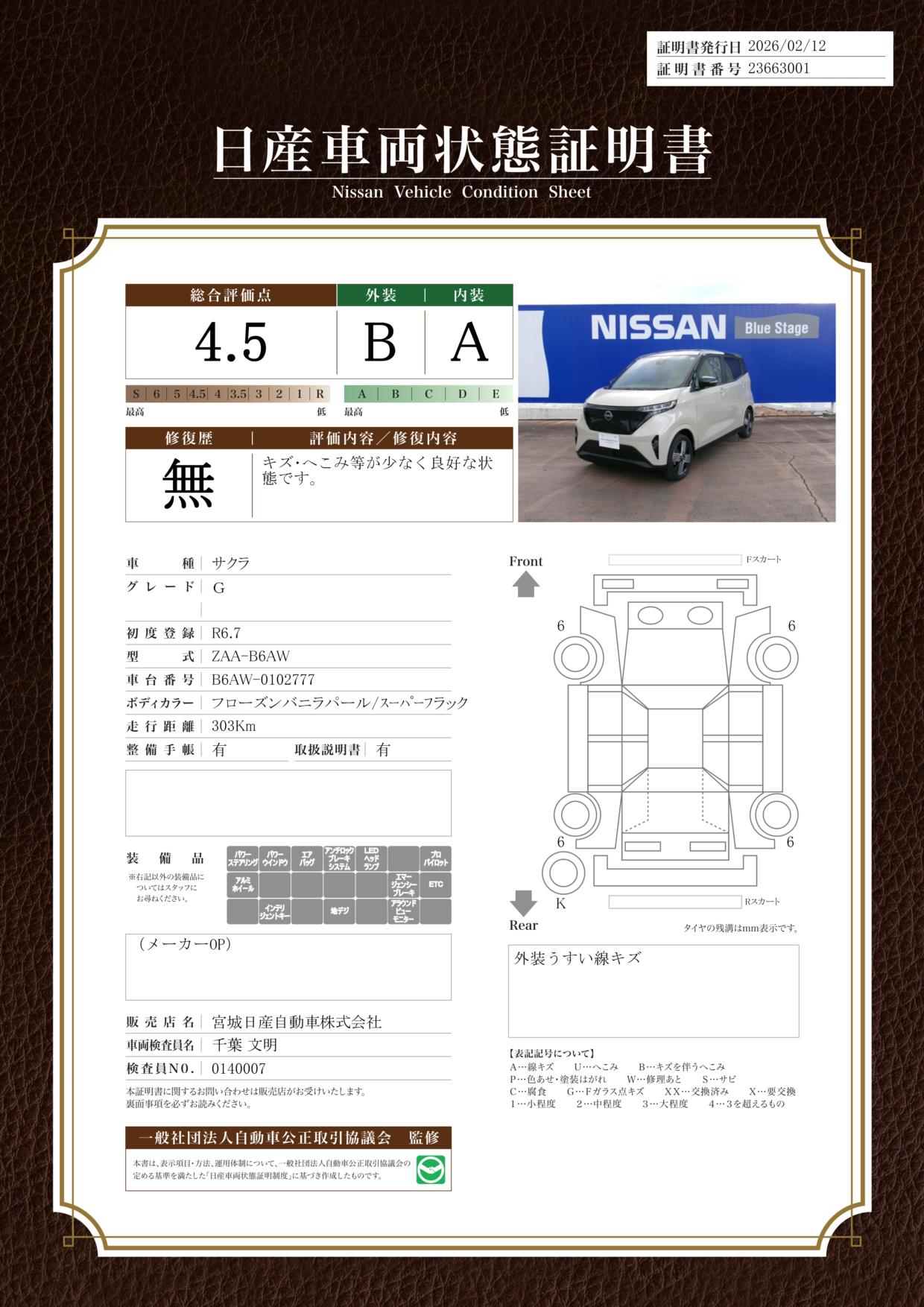 現状括弧書き内の年月まで車検有効期限が残っていますが、ご成約時に新しく車検を取り直します。なお取り直しの費用は車両価格に含まれています。